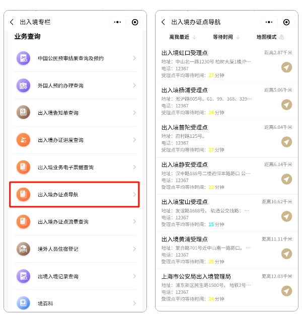 4、预审通过后,点击“进入预约排队系统”,选择受理地点、时间后点击“提交”,完成预约;提交成功后,按时前往对应受理点办理业务即可。打开“出入境专栏”中的“出入境办证点导航”服务,还可直接查询对应的办理点地址,一键导航。