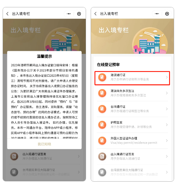 1、进入“出入境专栏”服务页面后,认真阅读温馨提示,点击“我已知晓”,即可选择办理事项,点击进入。