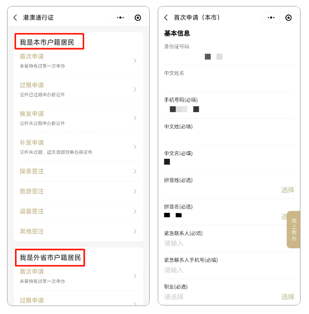 2、进入“港澳通行证”办理页面,根据个人实际情况选择对应人员类别及业务类别,进入信息填写页面,如实填写个人信息并确认无误后点击“提交”。
