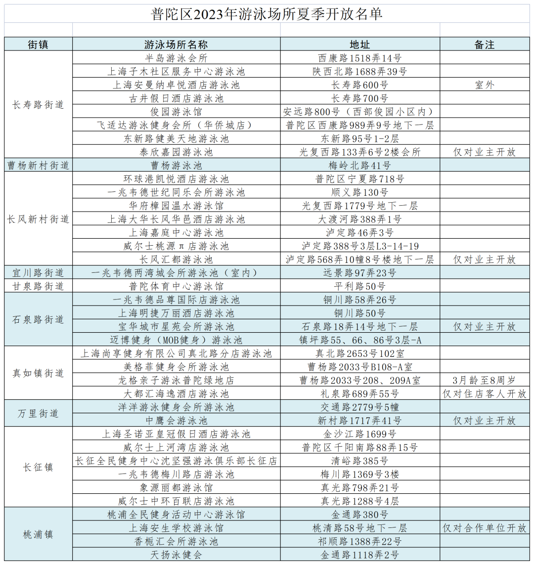普陀区2023年游泳场所夏季开放名单 2023年07月08日