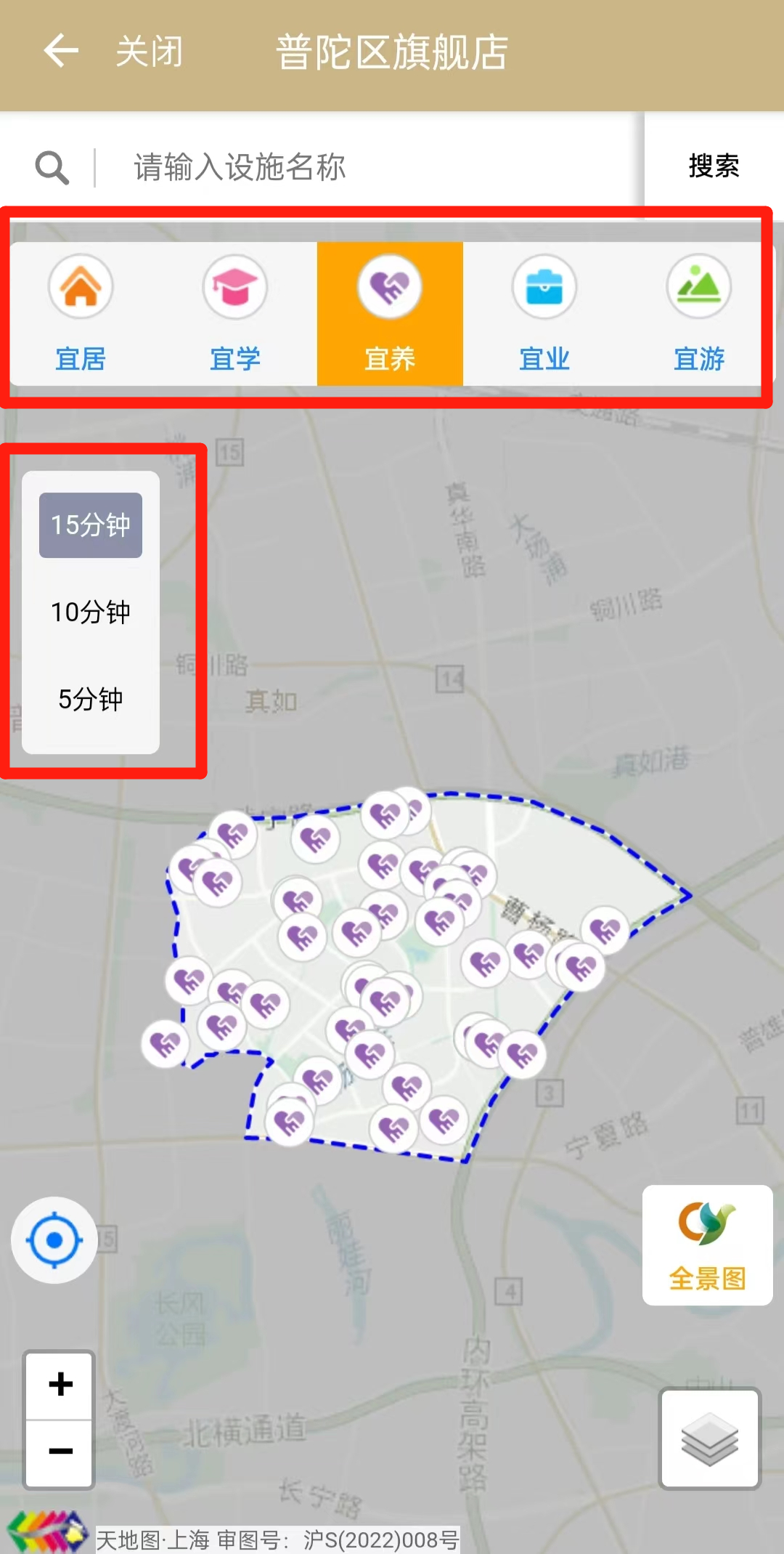 第三步:居民根据自身需求,可以轻松地找到曹杨社区中现有的宜居、宜业、宜游、宜学、宜养五类设施点以及实用的生活信息。此外,在《地图》中,居民还可以通过选择“5分钟”“10分钟”以及“15分钟”三个步行可达圈层,查看周围不同时间圈层内的设施点位,并通过导航功能一键查询路线。同时,动态查询地图还提供搜索功能,居民可通过搜索设施的名称,了解相关信息。
