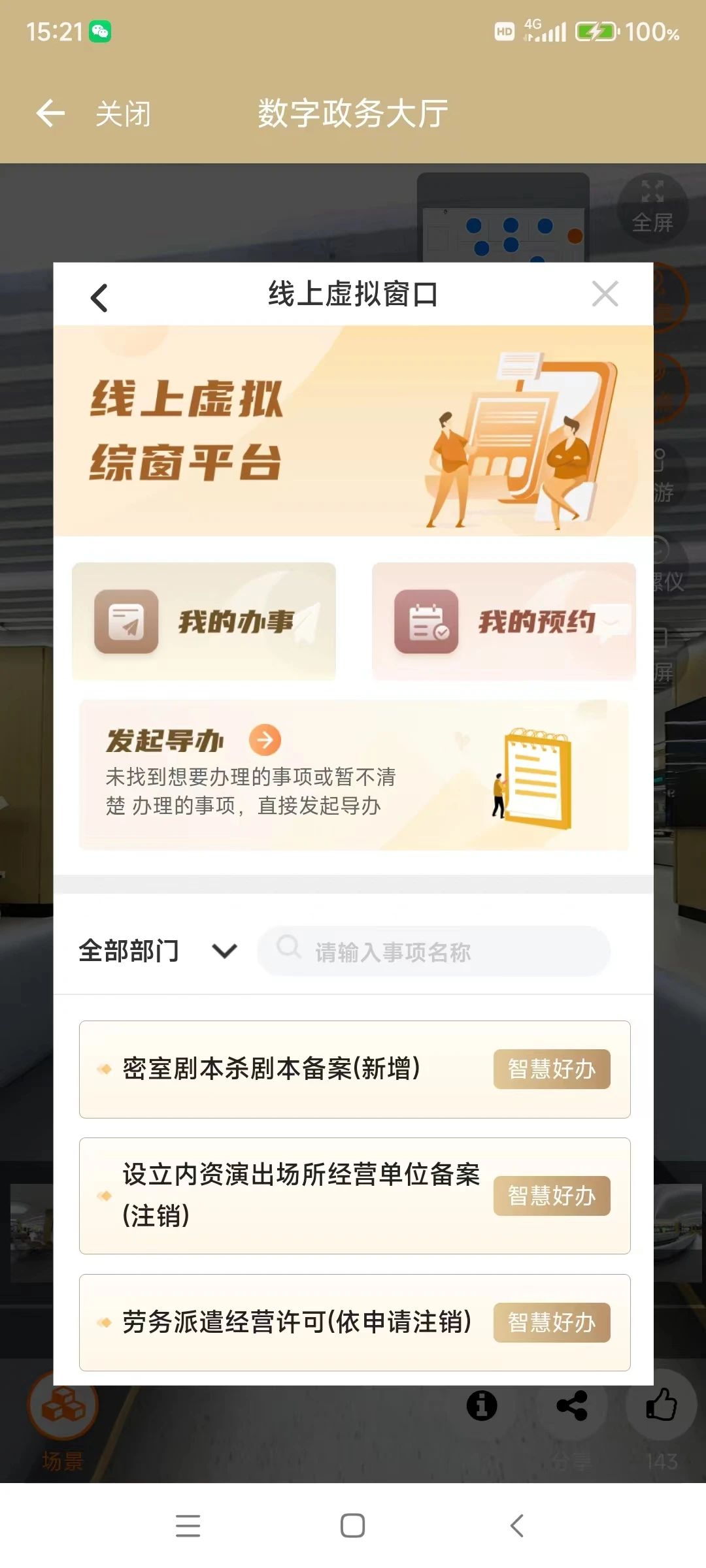 3.进入“线上虚拟综窗平台”首页后,申请人可以检索“事项名称”,或通过“部门列表”快速定位办理事项,点击“远程办理”开展办事。