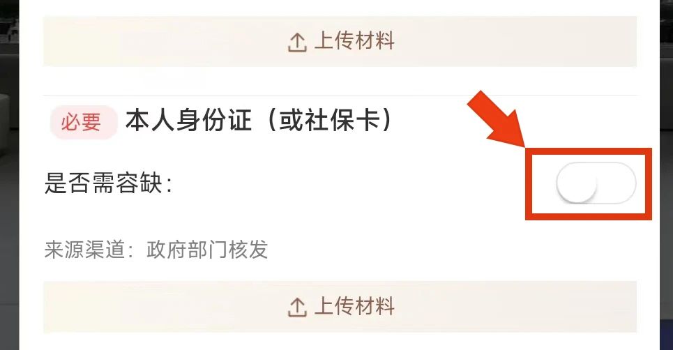 6.材料申报时,对于申请人不了解、无法直接上传的材料,系统提供容缺办理,申请人在“是否容缺”列选择“是”,不上传必要材料也能提交办件。