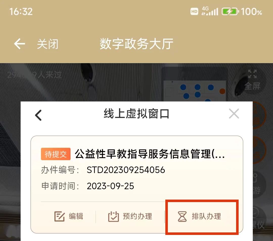 9.排队等候到号时,系统会短信提醒申请人,远程受理服务已准备完成,请尽快进入栏目开展办理。申请人根据短信,进入“我的办件”模块,点击“排队”开展线上办理服务。
