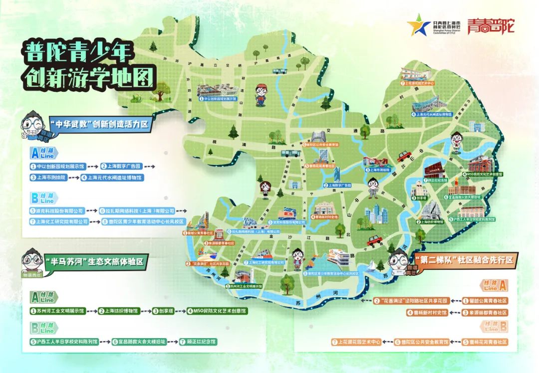 来源: 上海普陀日前,普陀青少年创新游学地图发布啦!普陀团区委围绕“生态文旅体验区”“创新创造活力区”“社区融合先行区”目标打造,形成三区手绘地图,推荐6条打卡线路,涵盖辖区内22个点位。