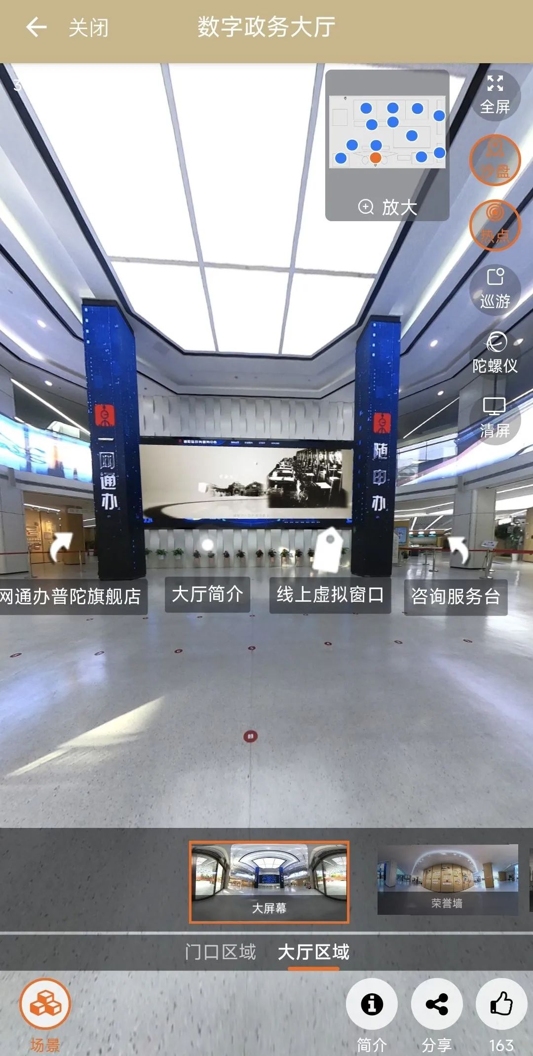 普陀运用全景VR搭建三维空间平台,建设数字化24小时自助服务区、咨询服务台、随申码体验区、政务公开服务区、综合受理窗口、帮办代办窗口和普陀政务直播间等,为市民提供服务简介、办事指南、服务内容等信息,构建集访问、浏览、查询、办事等多种功能于一体的移动端虚拟政务服务大厅。企业和市民只需“触达”虚拟空间,即可身临其境地享受空间全景及各类政务服务场景应用。