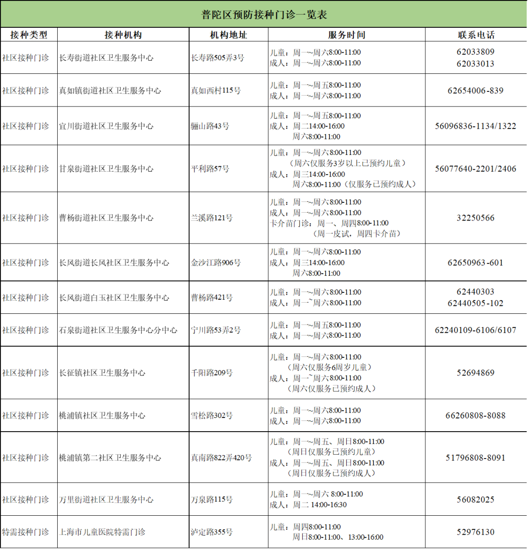 普陀区预防接种门诊一览表请收藏!可以预约接种带状疱疹疫苗 2023年12月06日