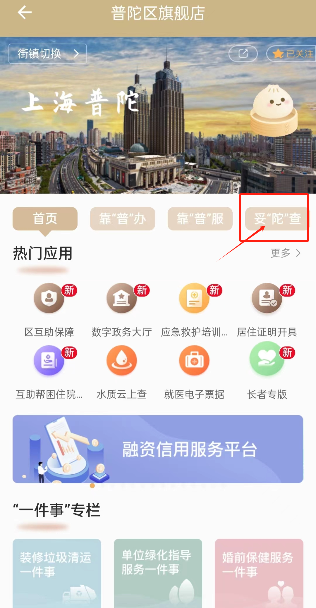 第一步:打开“随申办”APP,进入“普陀旗舰店”