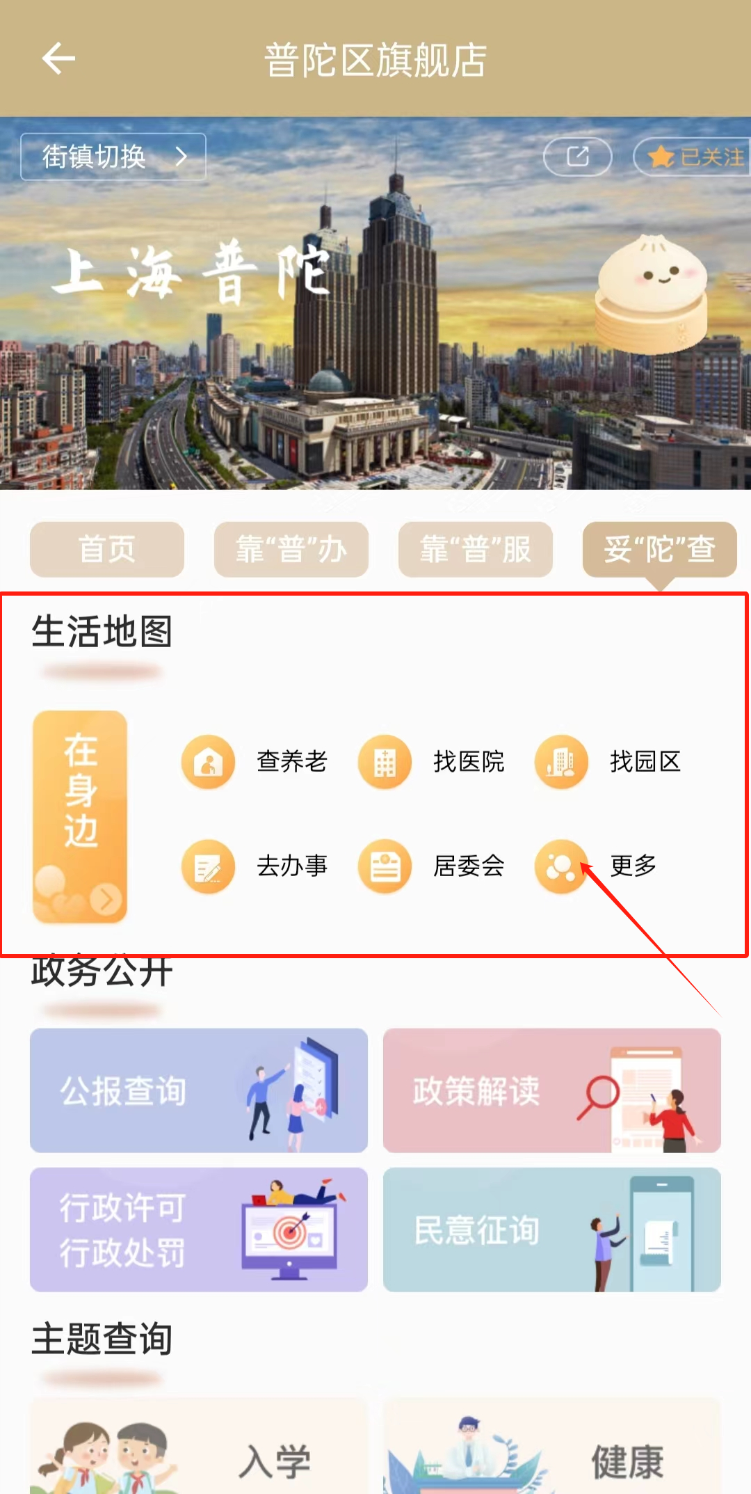 第二步:在“普陀旗舰店”中,点击进入“妥'陀'查”页面,再点击进入“生活地图”