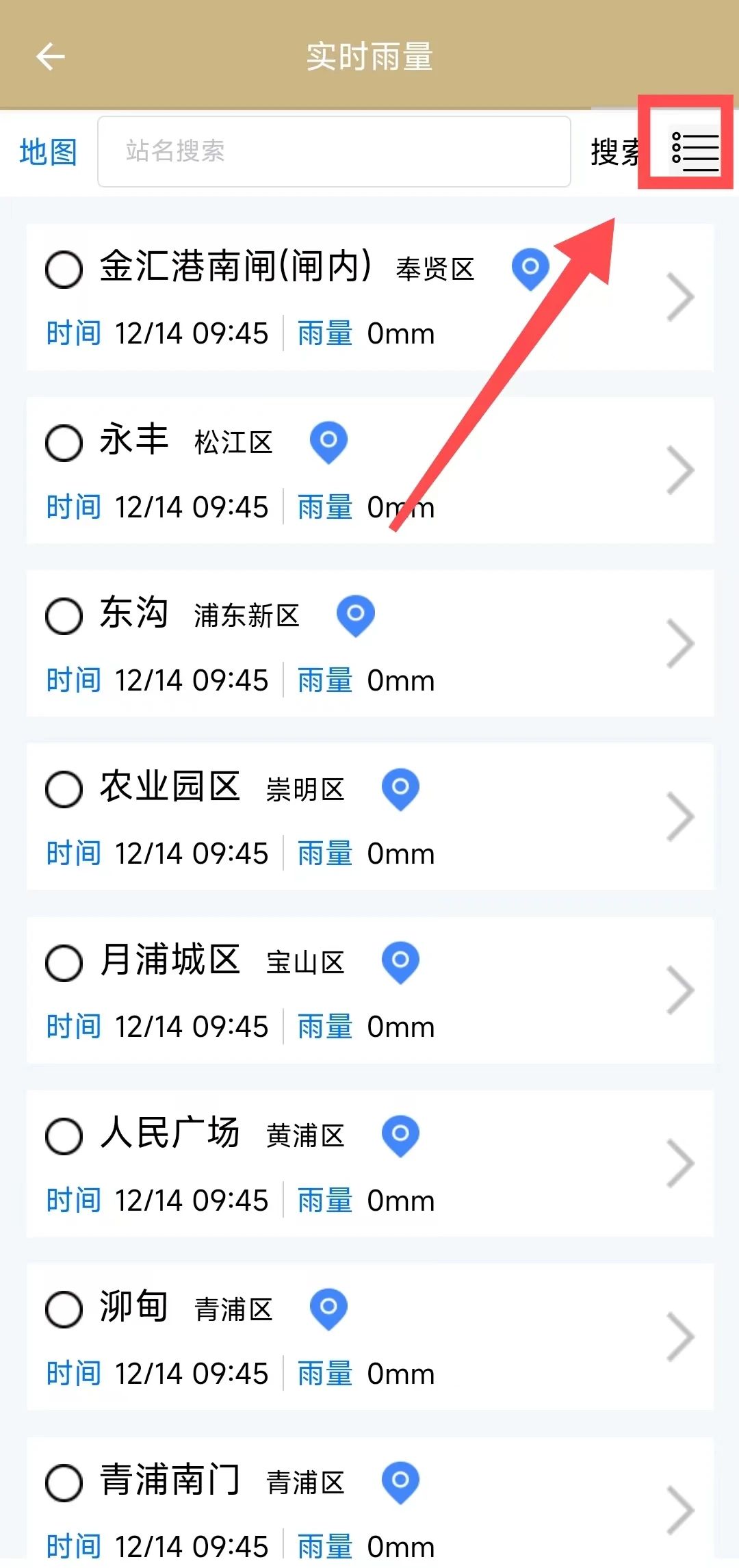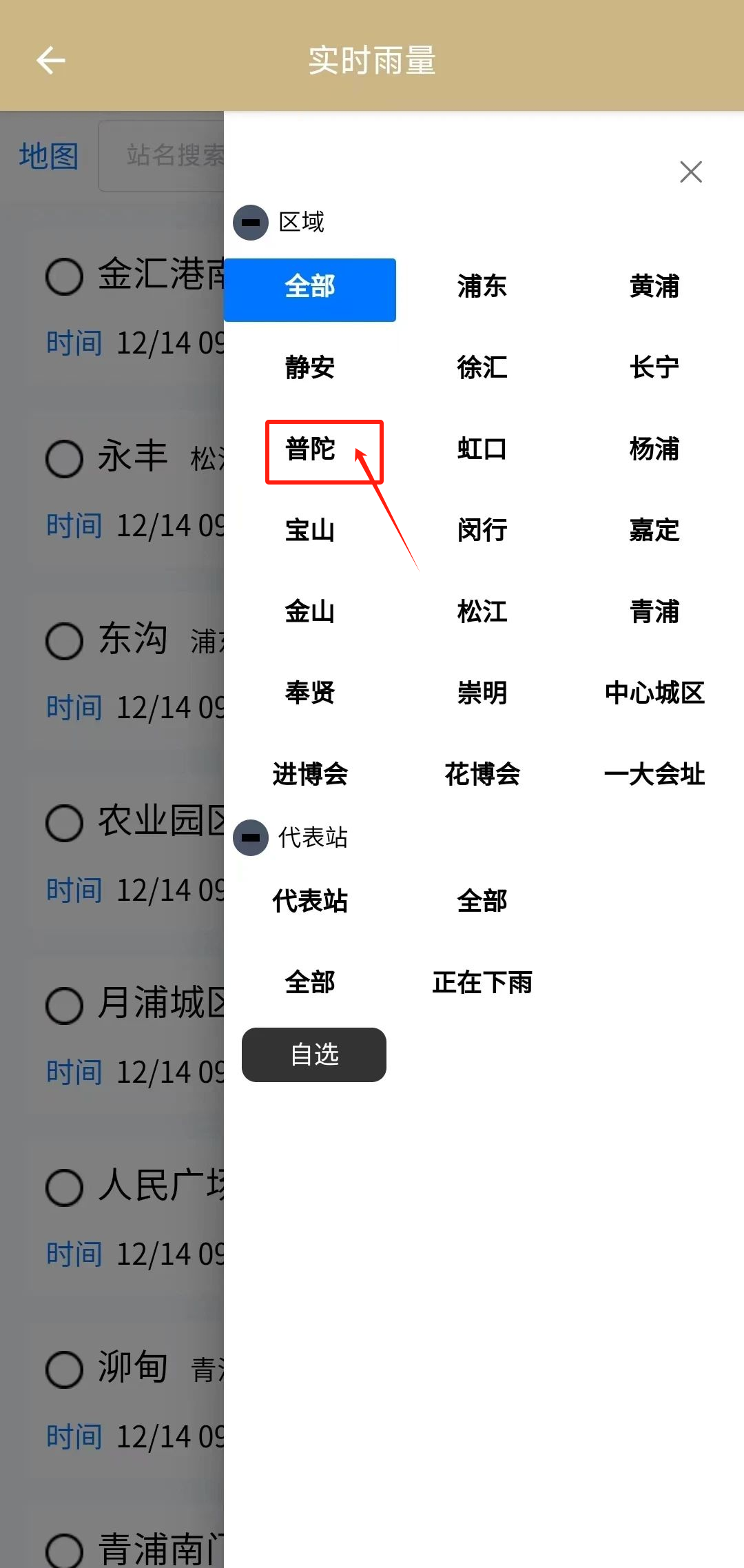 第三步:点击右上角按钮可根据区域、代表站进行筛选查找。点击“普陀”,就能看到普陀区的实时雨量啦!