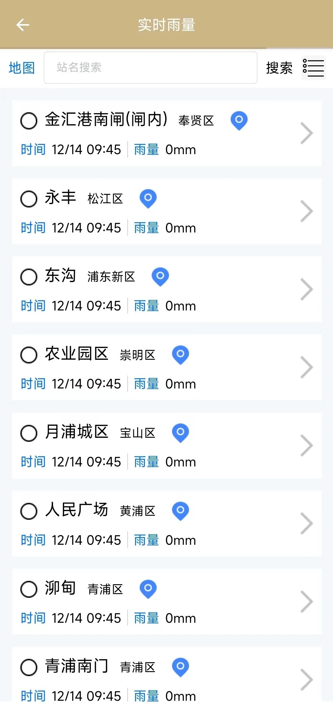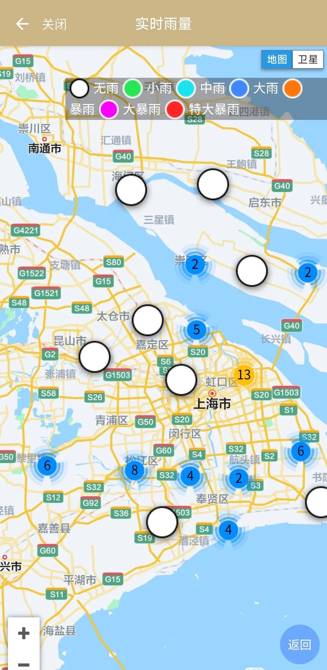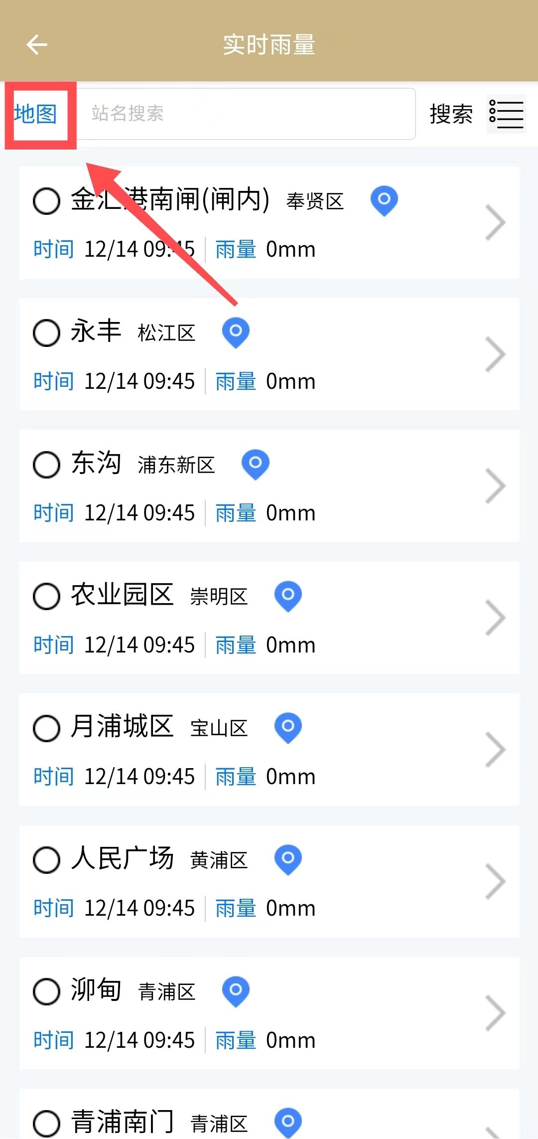 第四步:点击左上角“地图”按钮可查看实时上海雨量地图。
