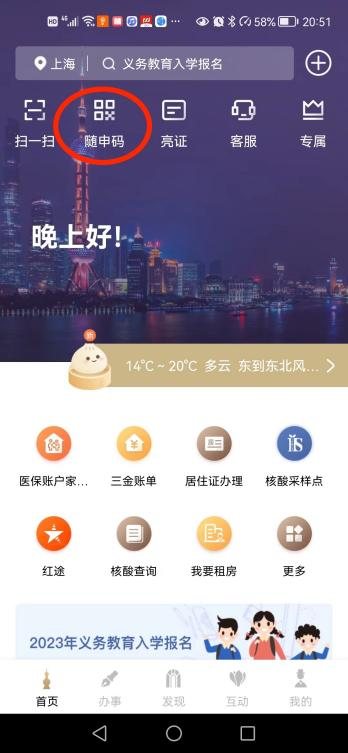 1、打开“随申办市民云”app,在首页左上方选择“随申码”