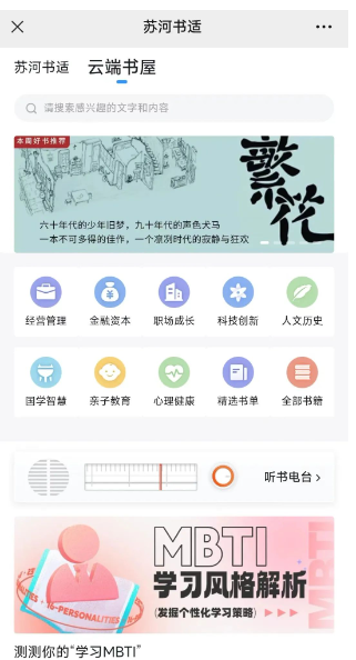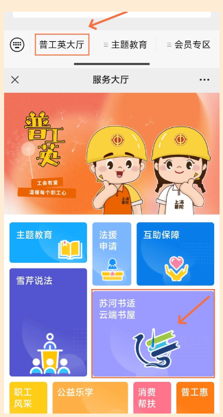 通过普工英微信公众号进入普工英大厅,点击“苏河书适 云端书屋”按钮进入主界面。