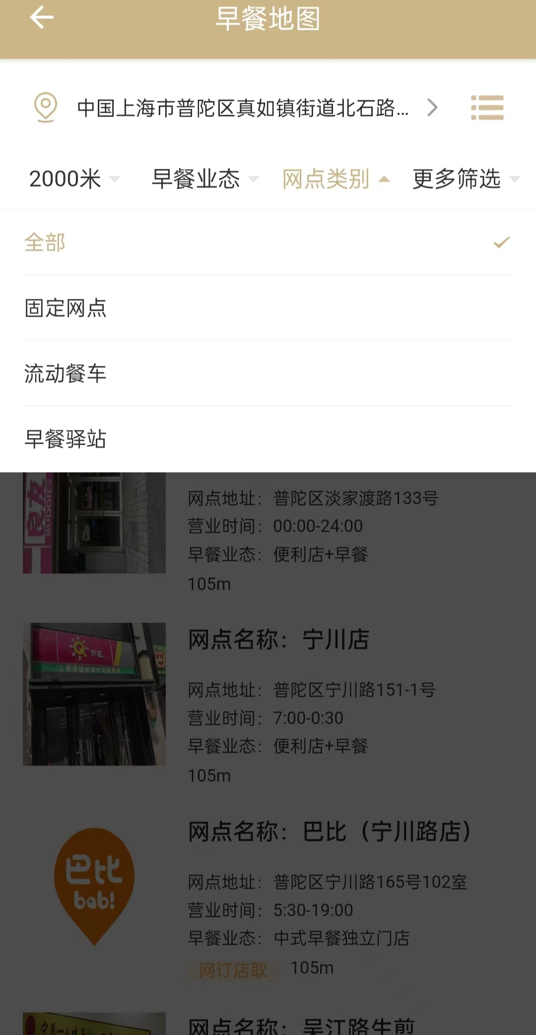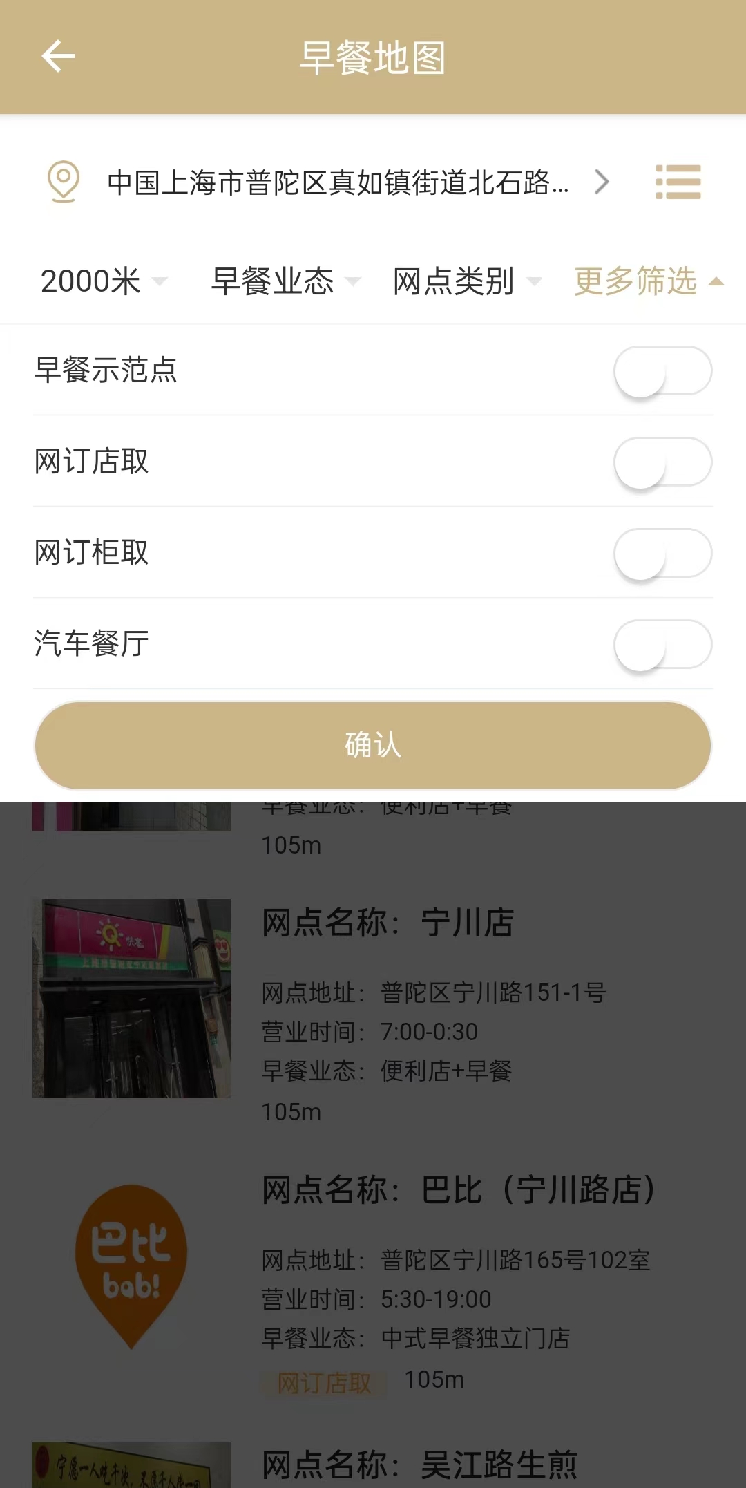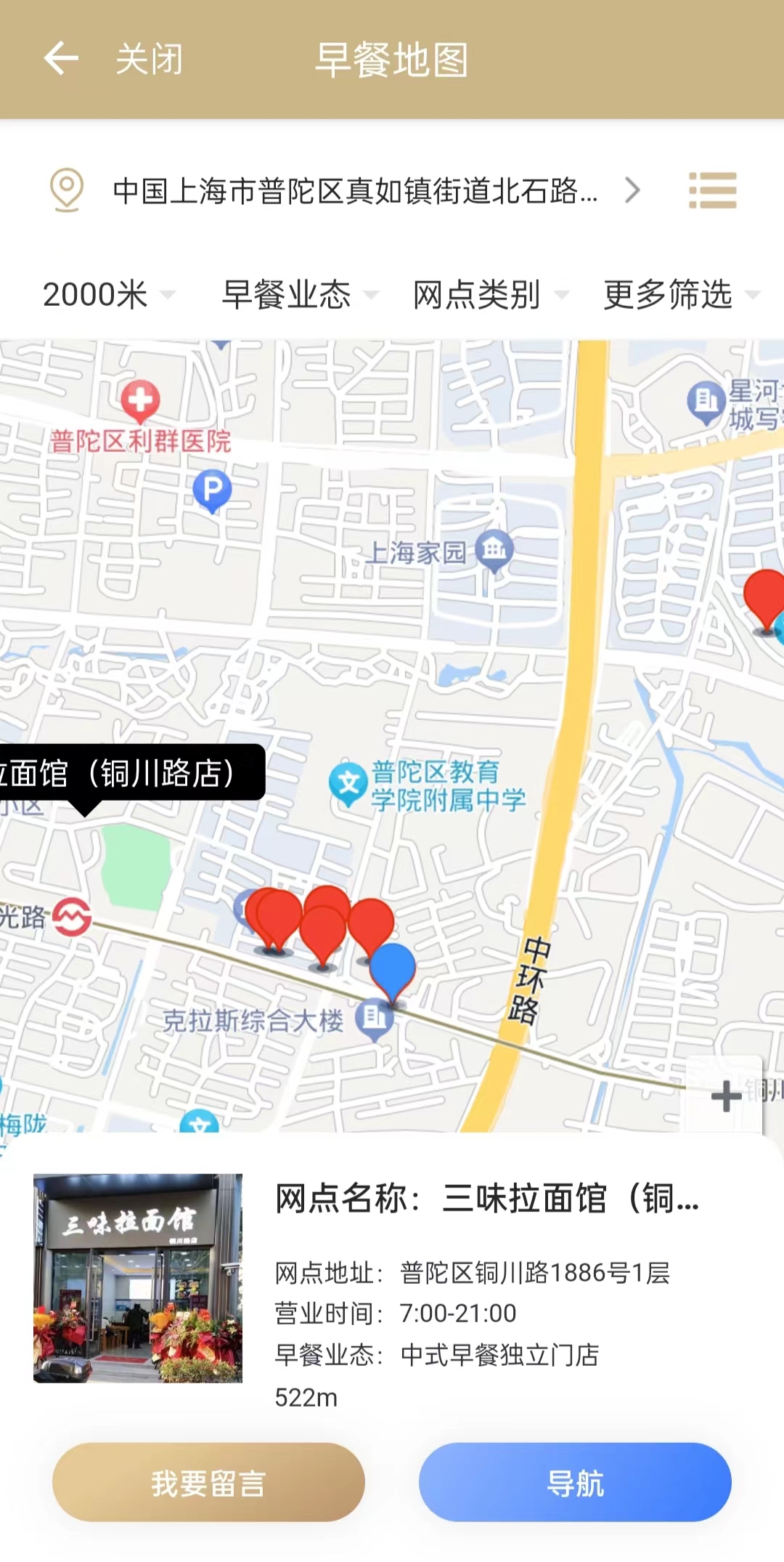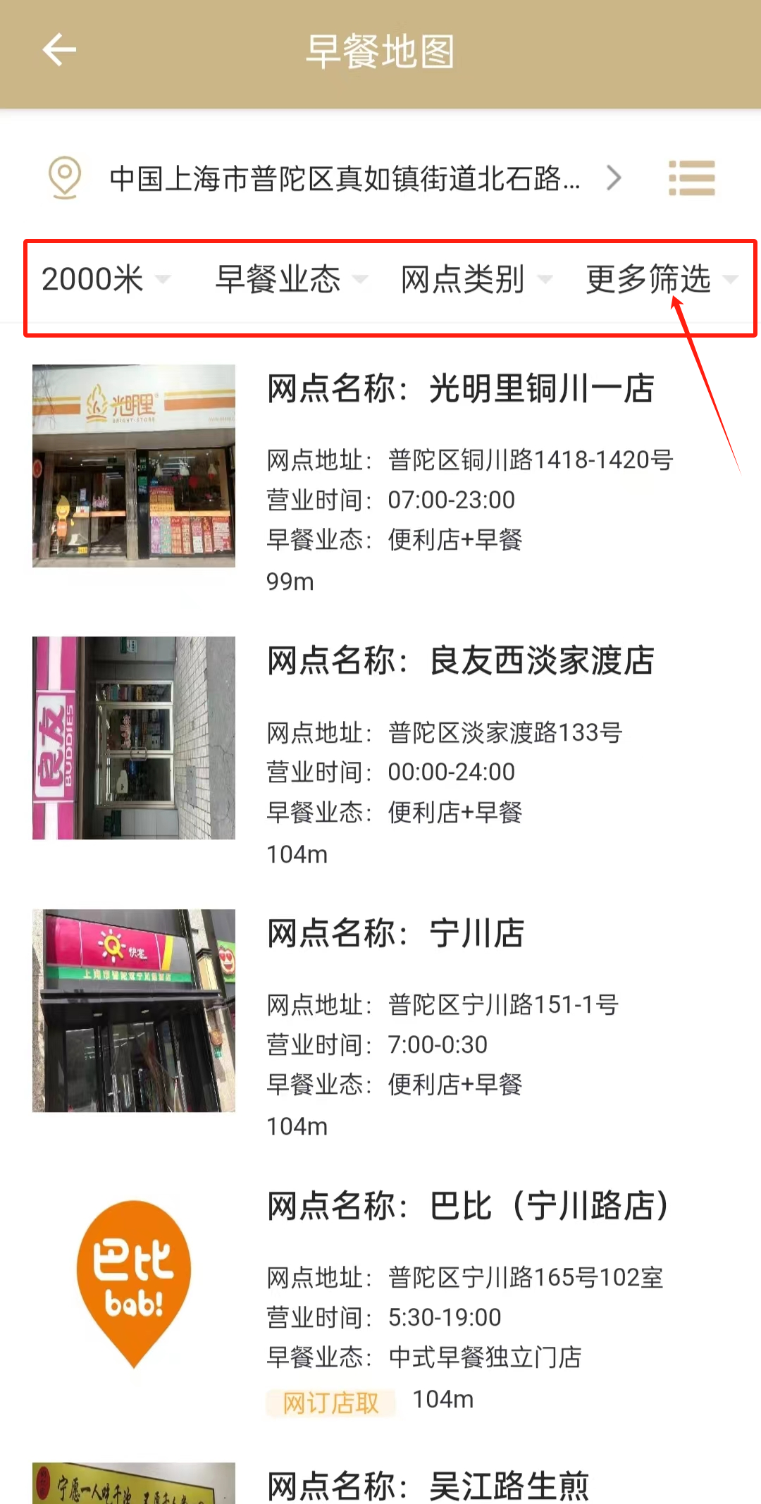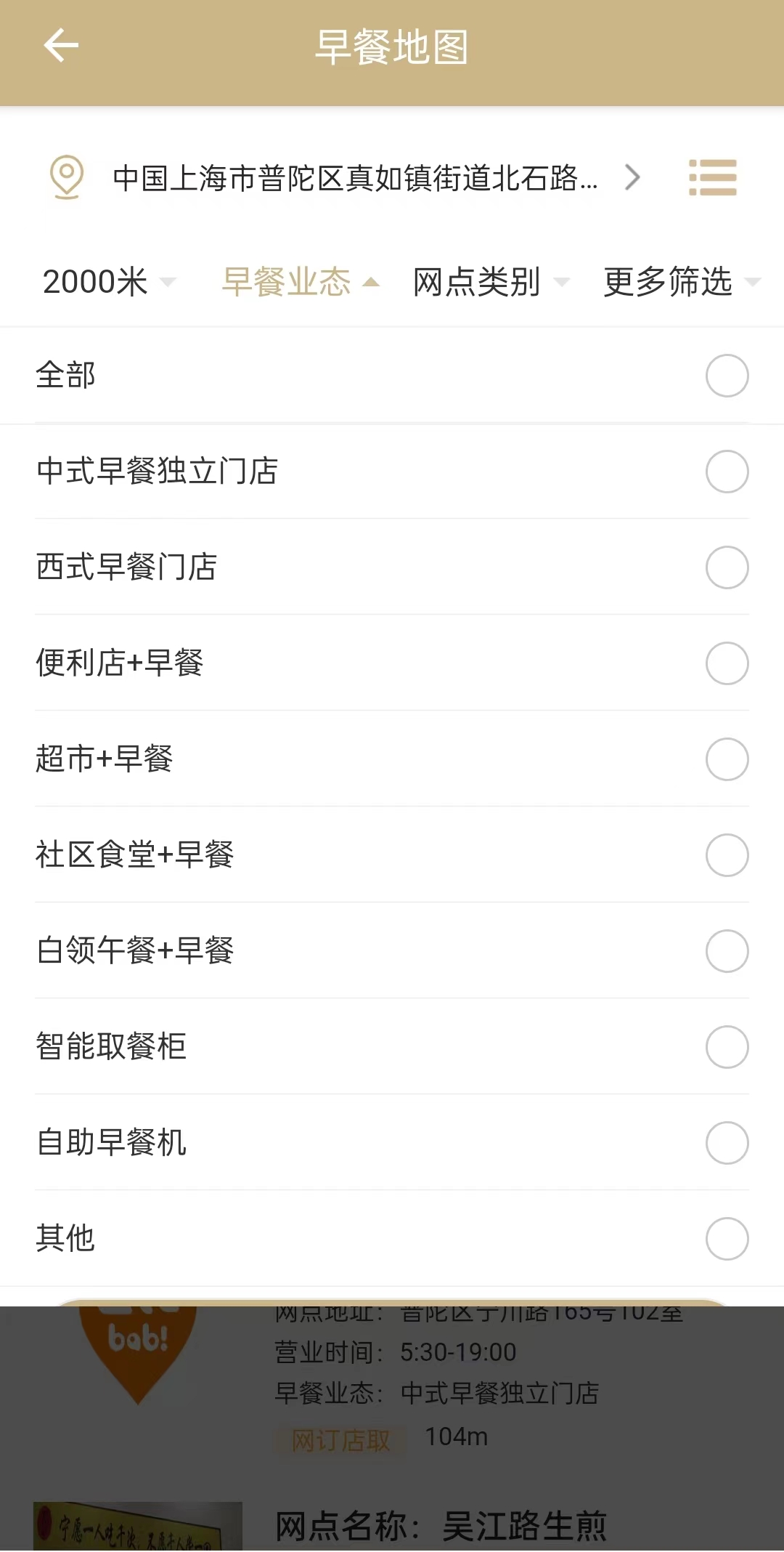 第二步:在“早餐地图”中,你可以搜索不同种类的早餐,中式早餐独立门店、西式早餐门店、社区食堂+早餐、智能取餐柜等任你挑选!