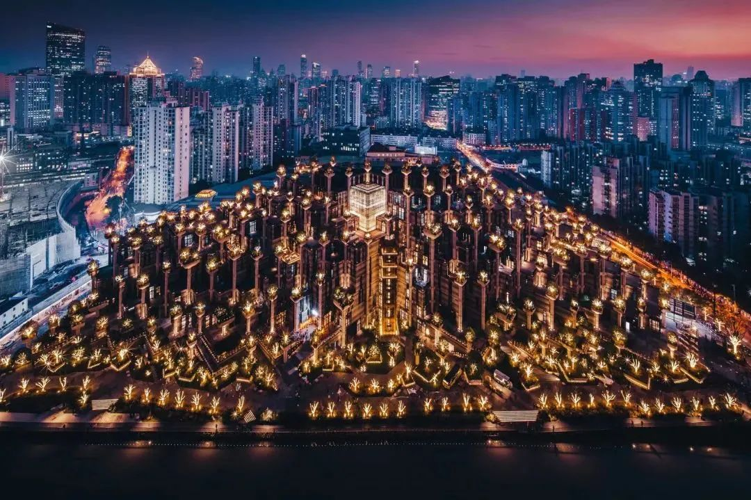 大洋晶典·天安千树位于莫干山路600号,由设计鬼才之称的托马斯领衔打造,整栋建筑使用立体造园的手法,由400级台阶和1000多根树桩露台构成,树桩露台上还栽种植被,使得建筑和自然完美结合。