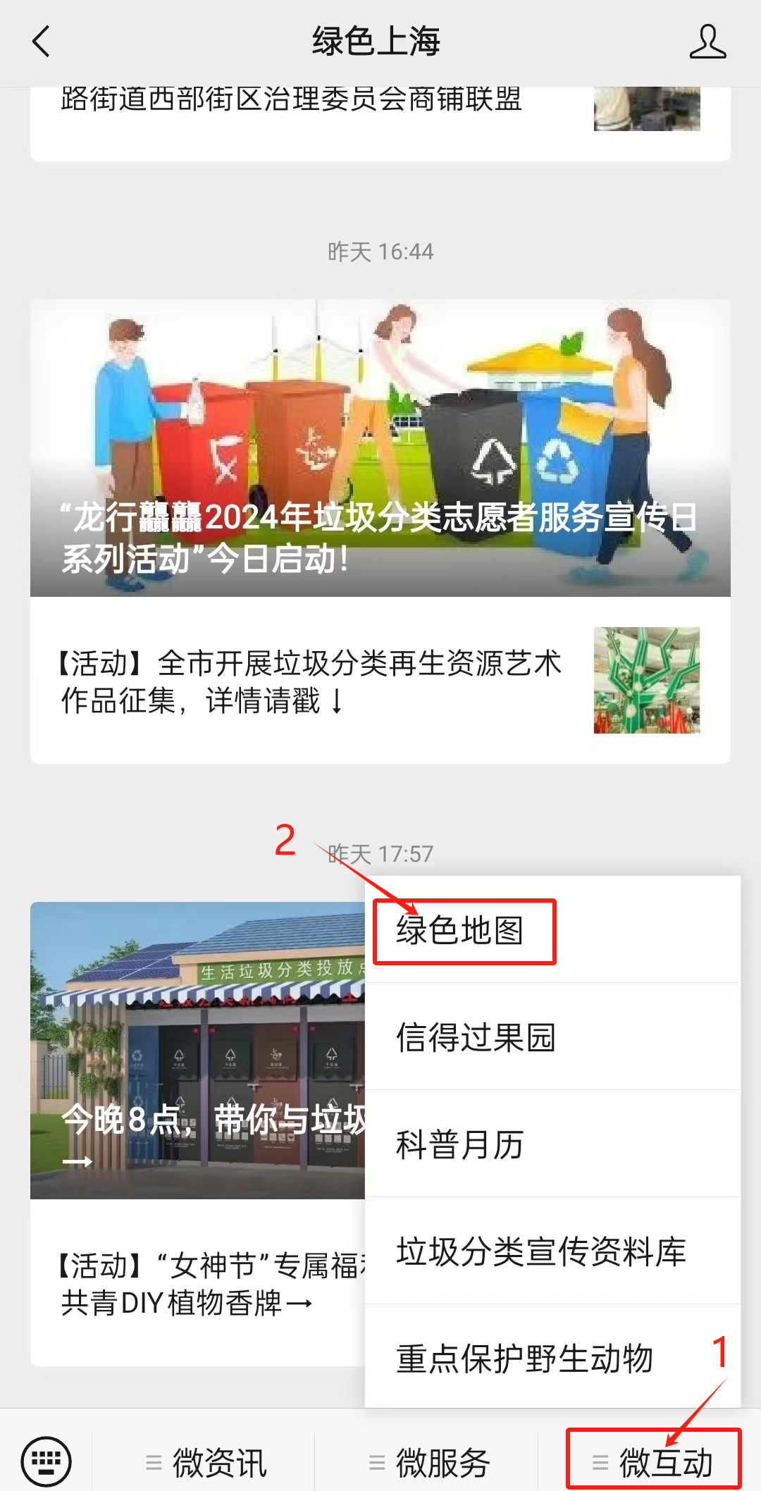 第一步:打开“绿色上海”公众号,在右下角的“微互动”中打开“绿色地图”
