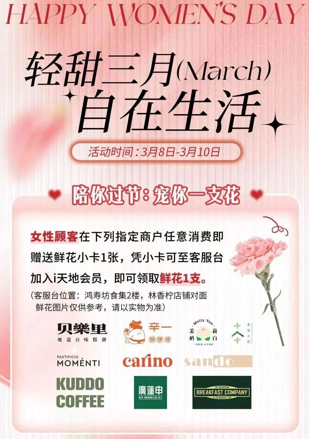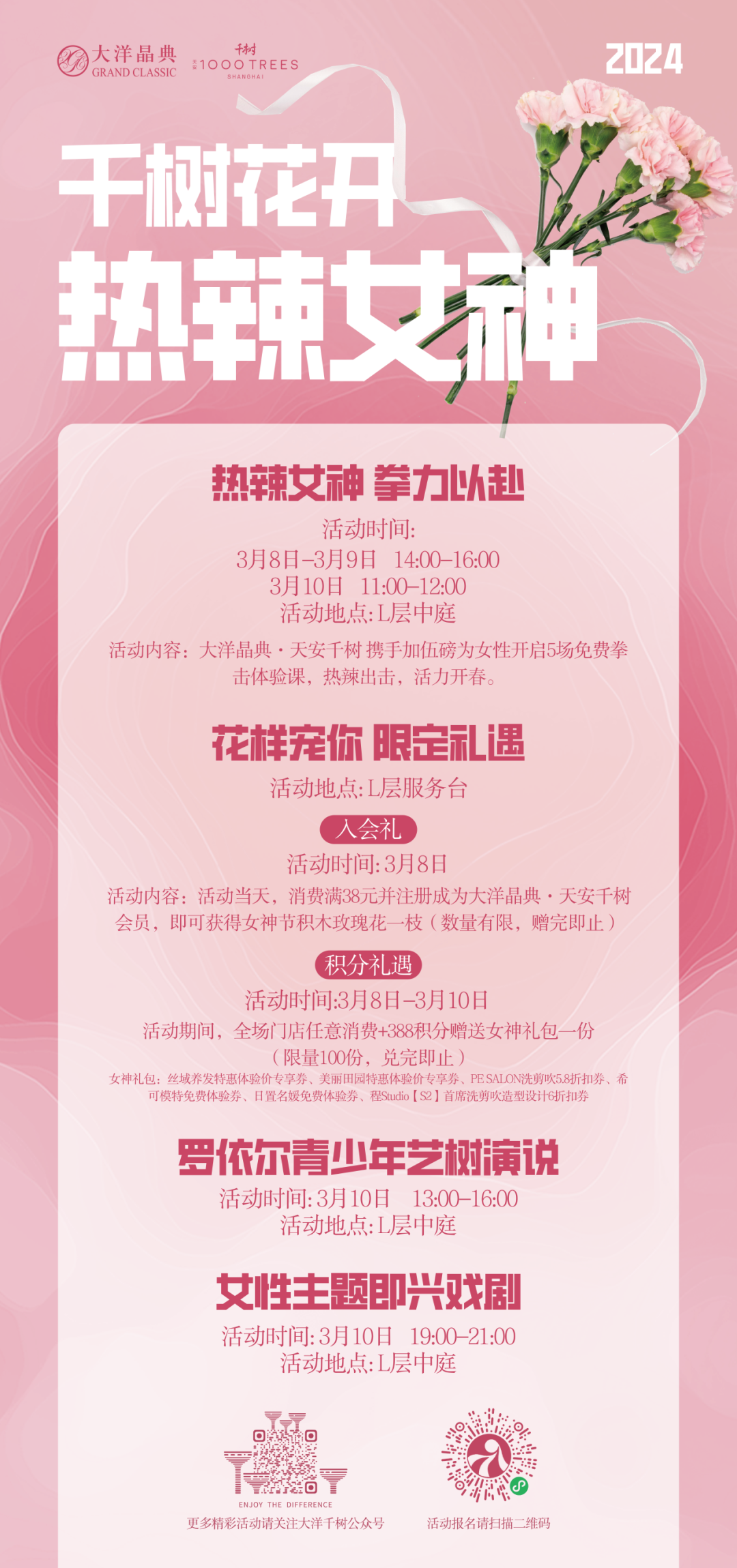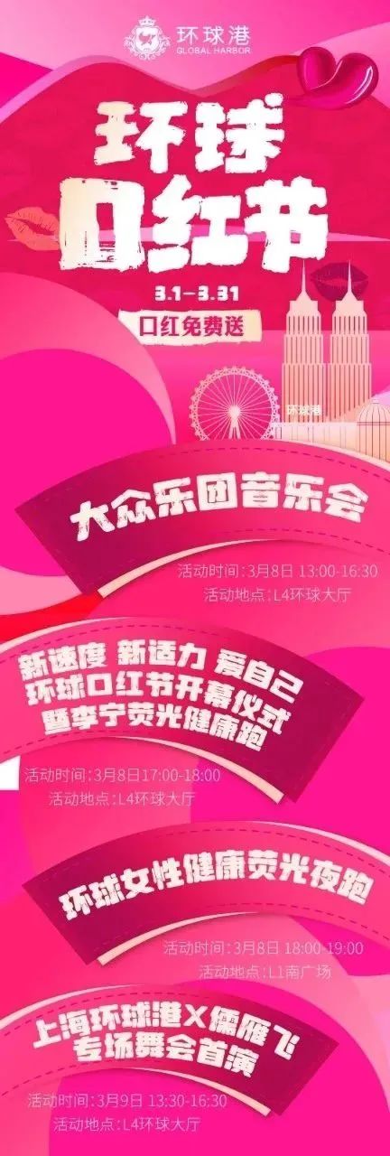 女神节来临,“真如花事”春日艺术灵感季将于3月8日-4月6日在上海真如环宇城MAX进行,半亩郁金香静待绽放,与你共赴一场春天的花事。女生们想要送给自己一件很哇塞的春日新装,锁定出街LOOK那就来这里吧!如果你想要意趣生活,传达精致态度,如果你想要简约、松弛、优雅与自然相融,如果你想要摒弃繁杂,回归简单,你都可以在这里找到你想要的。另外,巨型郁金香即将空降环宇城MAX中庭,快来拍照打卡,留下独属于你的春日氛围吧! 活动时间:3月8日-4月6日 活动地点:上海真如环宇城MAX(普陀区铜川路699弄1号) 环球口红节,邀您一起舞动青春 整个三月,上海环球港准备了万支口红免费送,还在等什么?今年的女神节,女生们来这里,可以体验一下独属于自己的狂欢。这里有女性专场演出,大众乐团音乐会、海派风格舞会、精彩旗袍秀,让你从生活中的多重角色中剥离出来,享受这片刻的欢愉与心灵上的放松;这里有以“新速度、新适力、爱自己”为主题的环球口红节震撼启动仪式,这里即将开启荧光健康跑,邀您与各行各业的女性代表一起慢跑苏州河,尽情展现健康生活方式。 活动时间:3月1日-31日 活动地点:上海环球港(普陀区中山北路3300号) 千树花开,热辣女神 三月的苏州河畔,惬意生活再度归来。在这个女神节,来千树赶赴与春日的约定,成为自己心目中的那位热辣女神。女性可以“拳力以赴”,挑战自我,在拳击训练中展现力量与魅力。女性可以“自由表达”,在别开生面的即兴戏剧表演中,与演员们共同完成戏剧的创作和呈现。女性可以感知美,跟随平易近人、轻松愉悦的罗伊尔艺术演说,透过沪上各学校的优秀小艺术家的眼光,了解艺术史上大艺术家们小时候的趣事,和他们对艺术和生活的独特见解。 活动时间:3月8日-10日 活动地点:大洋晶典·天安千树(普陀区莫干山路600号) 幻彩镜遇,我的美由我做主 一年一度的女神节,百联中环让你感受来自“她”风采的独特魅力!来百联中环,活动期间,满足任意金额化妆品类消费或任意其他品类消费满一定金额即可获得一次女神节专属抽奖机会。同时,三八节期间,化妆品都有折扣,让每一位女神在变美的路上畅通无阻。 活动时间:3月6日-10日 活动地点:上海百联中环购物广场(普陀区真光路1288号) 全力以赴,绽放有礼 3月8日至10日,上海长风大悦城三八节福利,给予你一年四季的宠爱。为您打造“花漾团购”,美味券、美力券和美貌券等各种团购券等你来抢;“女神专享”开启美美美模式,一定不要错过哦!更有花花力Max三重消费礼遇,全力以赴,为您美“力”全开! 活动时间:3月8日-10日 活动地点:上海长风大悦城(普陀区大渡河路196号) 轻甜三月,自在生活 在属于女性的节日,请卸下硬壳,在松弛自在的烟火气中,一起享受自我,用心生活!活动期间,女性顾客在鸿寿坊指定10家商户任意消费并加入i天地会员,即可领取鲜花1支。三月下午茶特别优惠同步放送,承包你的三月轻甜时光。 活动时间:3月8日-10日 活动地点:鸿寿坊(普陀区新会路236弄) 热辣春日,唤醒计划 元气满满的春天与女神节相遇,来长寿旭辉里一起拥抱自然,赴一场春天的约会。这里给女性顾客带来了满满的专属福利,10积分即可兑换咖啡指定款,收下这杯春季特调,和盎然春意碰个满怀;女性顾客5积分或当日任意消费并积分即可参与“女神节扎花DIY”,为你所爱的人扎一束花,带回家送给TA;女性会员当日现场消费满一定金额,即可现场兑换一份女神节专属花束;另有女神节专属福利券,助你享受美好的女神假日。 活动时间:3月1日-12日 活动地点:长寿旭辉里(普陀区长寿路333号)