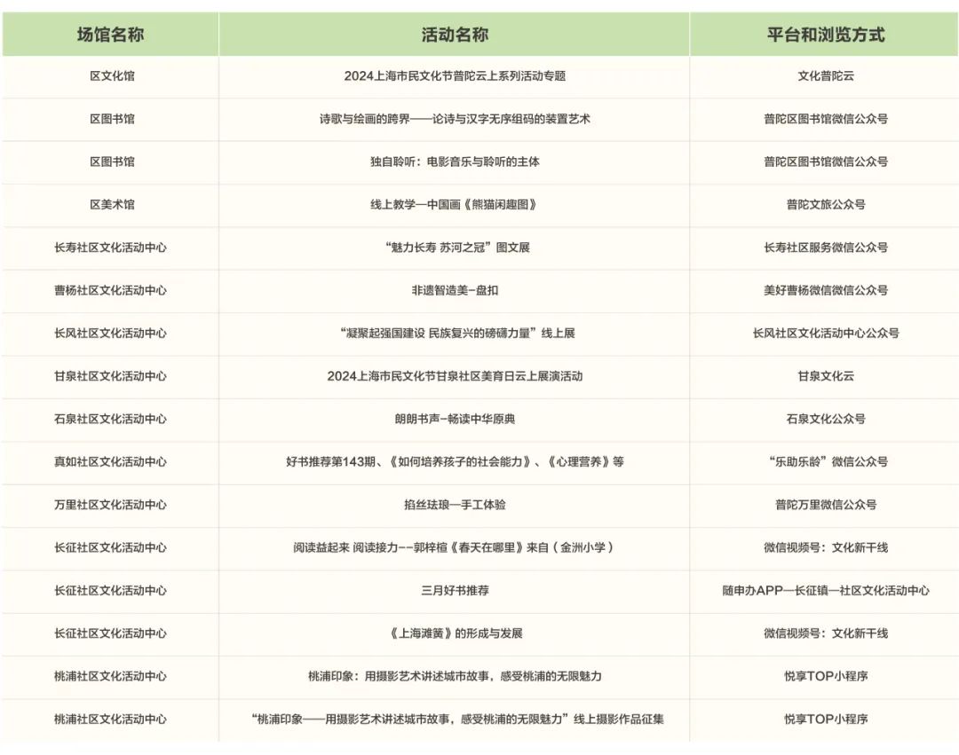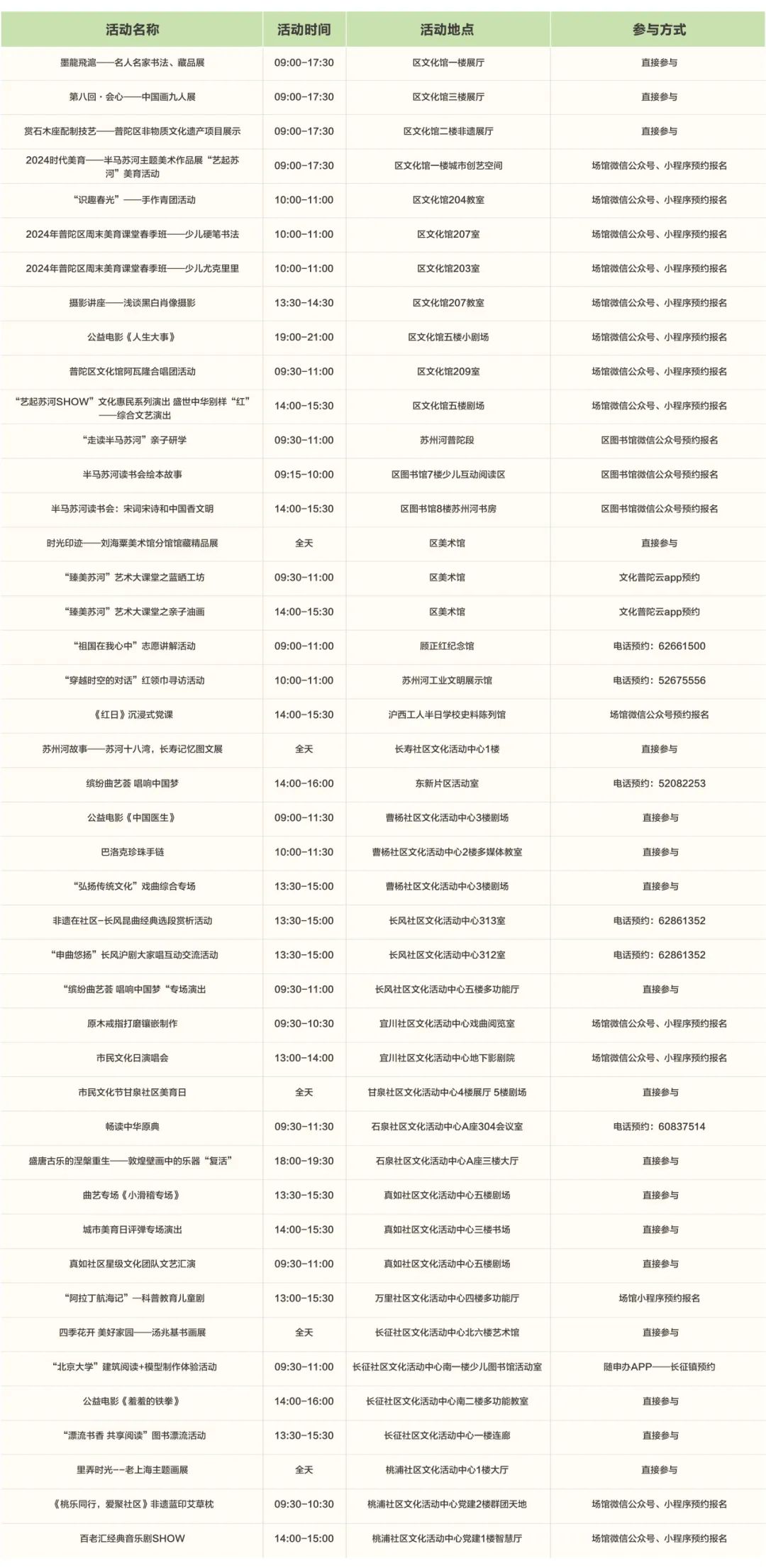 2024上海市民文化节“城市美育日”将于3月30日开启,普陀区在半马苏河广场、苏州河畔长风书院以及全区各级文化场馆为市民朋友们准备了形式丰富、内容多样的美育和惠民活动。让我们一起在这个春意盎然的周末,感受艺术、寻找美!