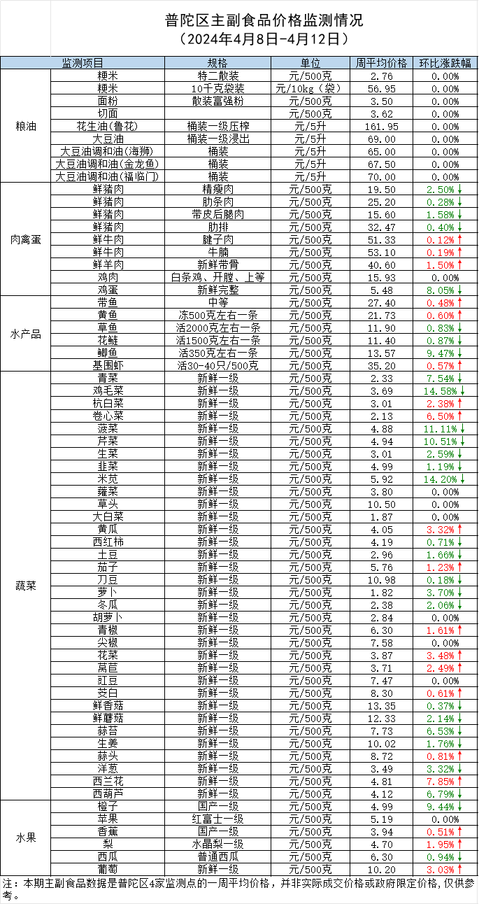 普陀区主副食品价格监测情况 (2024年4月12日)