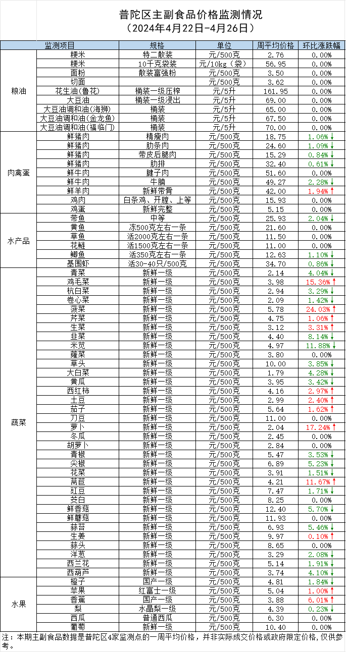 普陀区主副食品价格监测情况 (2024年4月26日)
