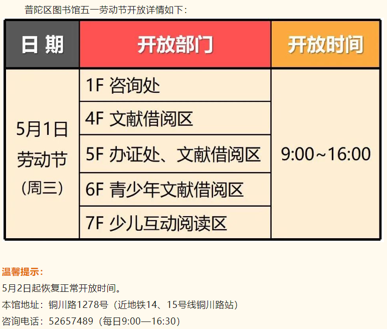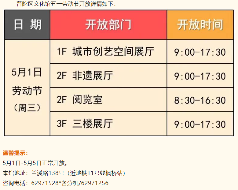 普陀区公共文化场馆2024年劳动节假期开放时间安排来啦!
