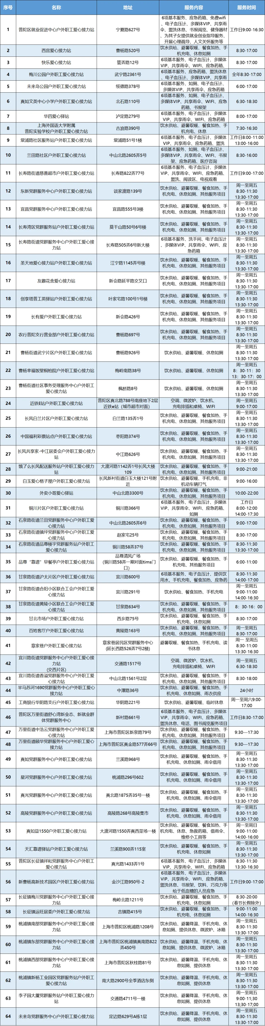 普陀区区属户外职工爱心接力站一览表