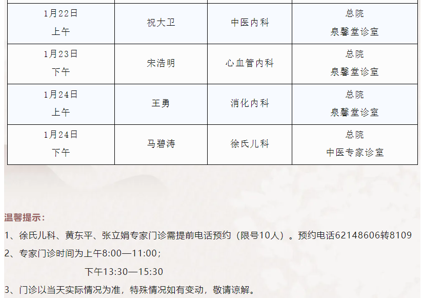 注:出诊时间供参考,具体情况请详询服务台