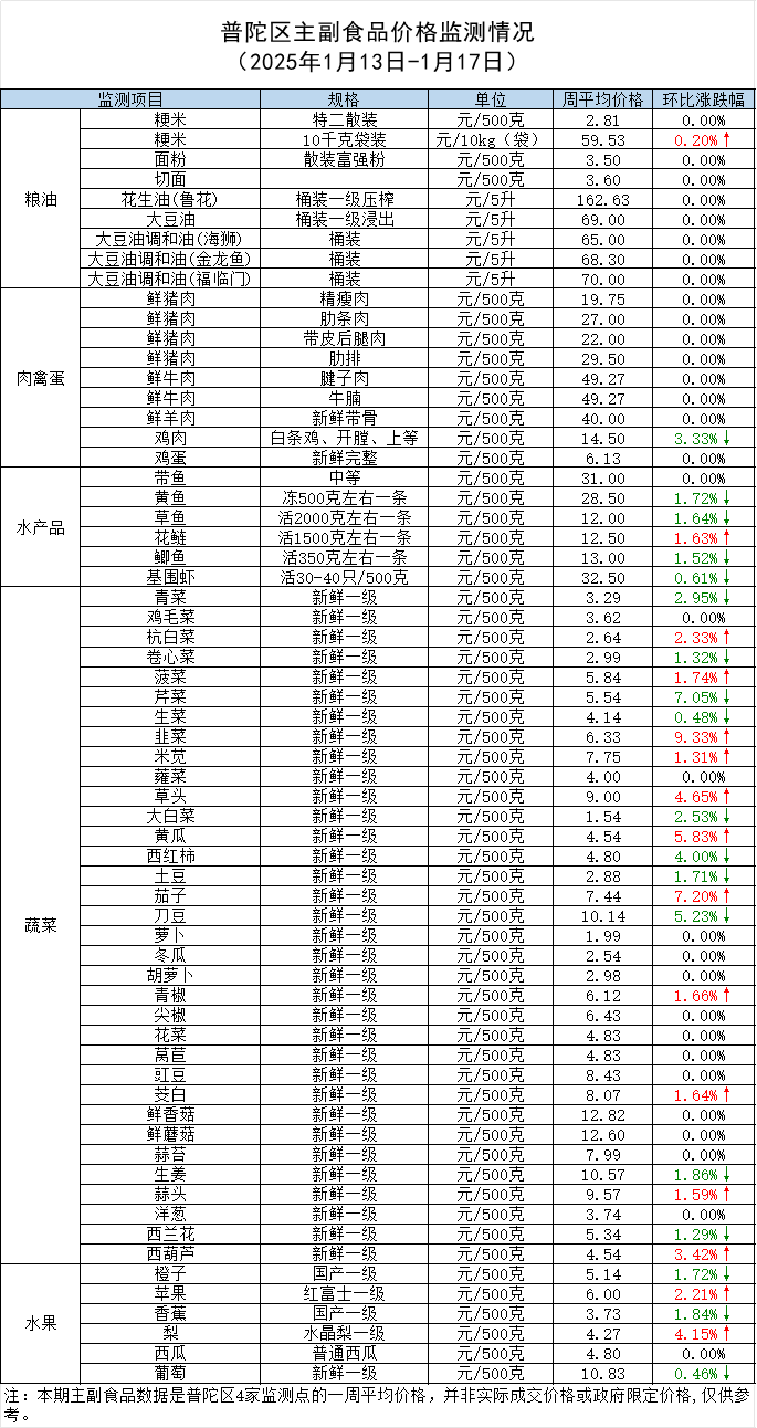 普陀区主副食品价格监测情况 (2025年1月17日)