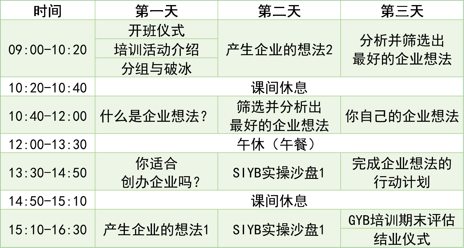 培训为期3天,为“马兰花计划”第一阶段课程,即创业意识激发期培训,旨在帮助创业者了解什么是企业,什么是企业想法,分析评估自己是否适合创办企业,通过掌握产生企业想法的方法产生更多的创业项目,并从中筛选、分析、确认最适合自己的创业方向。