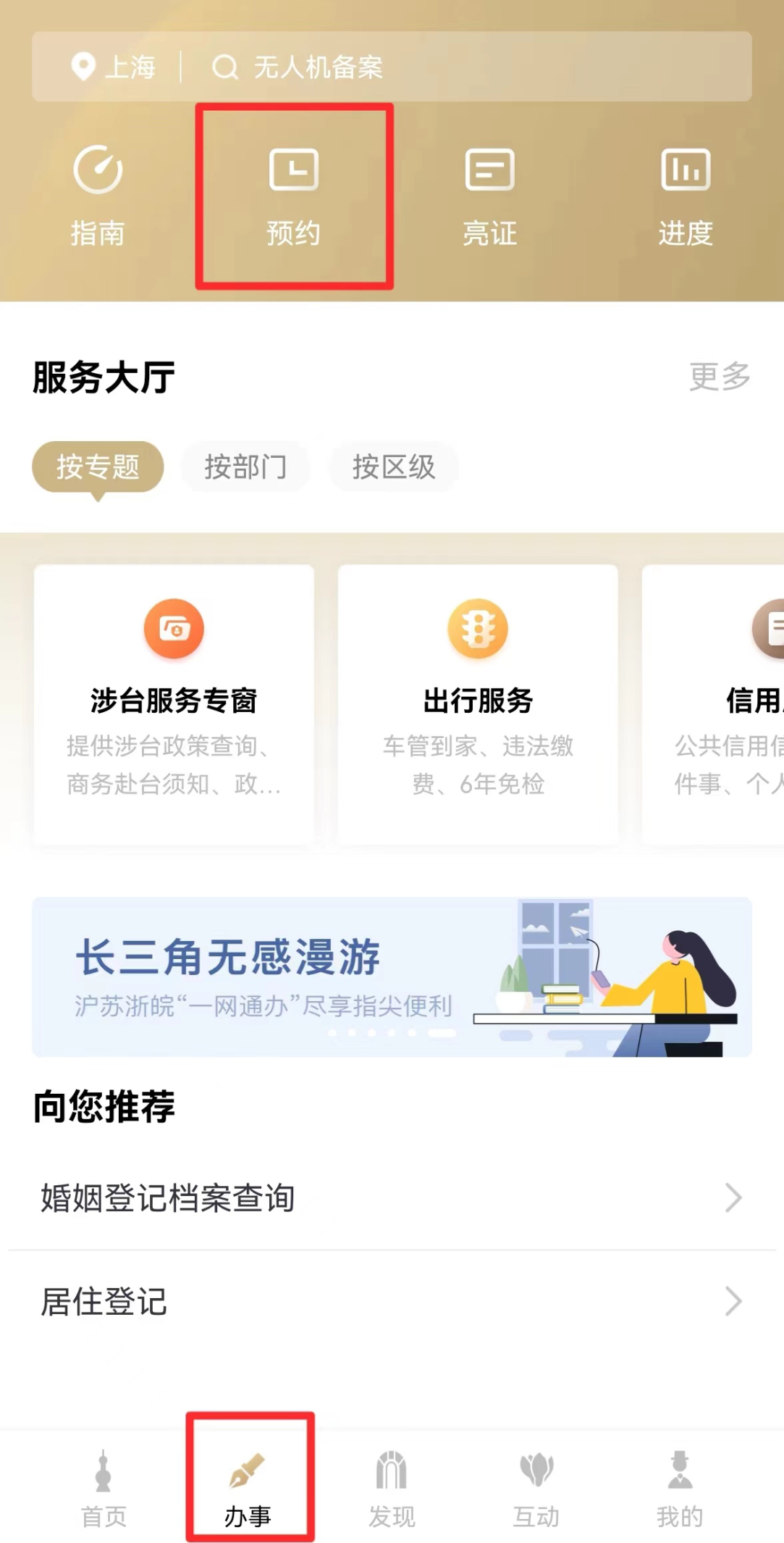 第一步:登录“随申办市民云”APP,选择主页下方的【办事】栏目,点击【预约】选项