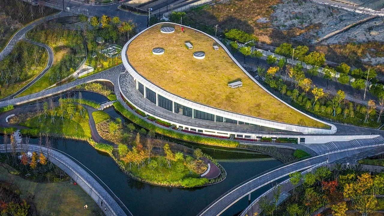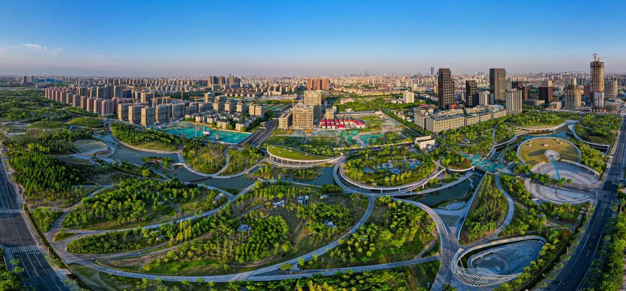桃浦中央绿地占地50万平方米,共6个地块,“J”型布局,是中心城区最大的“城市绿洲”。公园的形态以中国传统书法和舞蹈为灵感,以“Moving Cloud Running Water·行云流水”为概念。