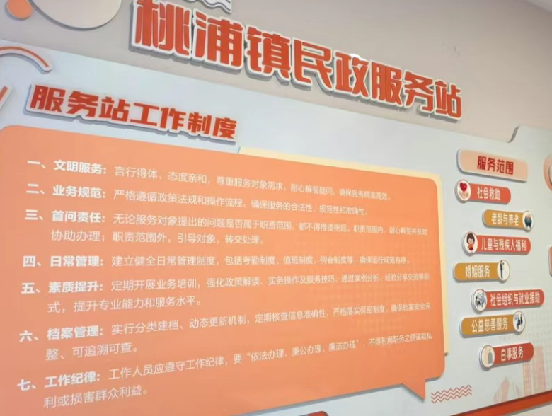 聚焦社会救助、老龄与养老、儿童福利、残疾人福利、婚姻咨询、社会组织管理、就业创业、公益慈善、白事服务九大核心职能,为居民提供业务受理、材料审核、政策解答等“一站式”便民服务,同时联动社会组织定期开展助老助残、儿童关爱、心理疏导等特色项目。