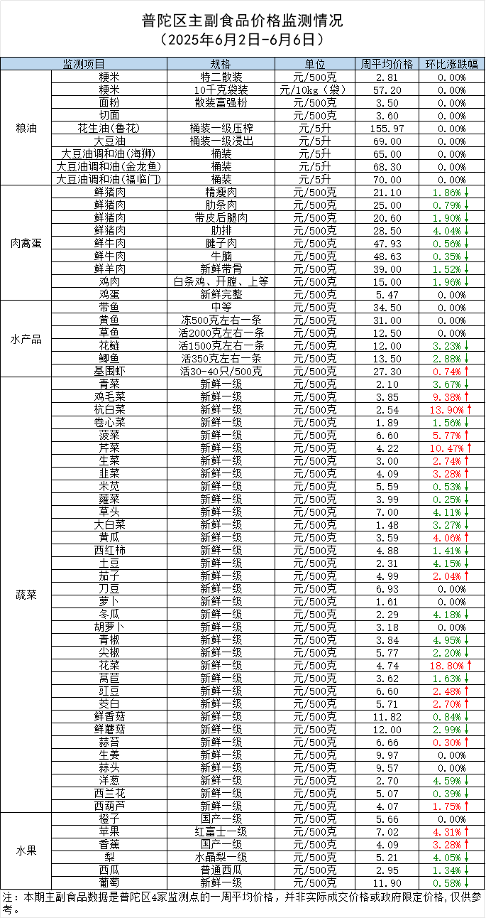 普陀区主副食品价格监测情况 (2025年6月9日)