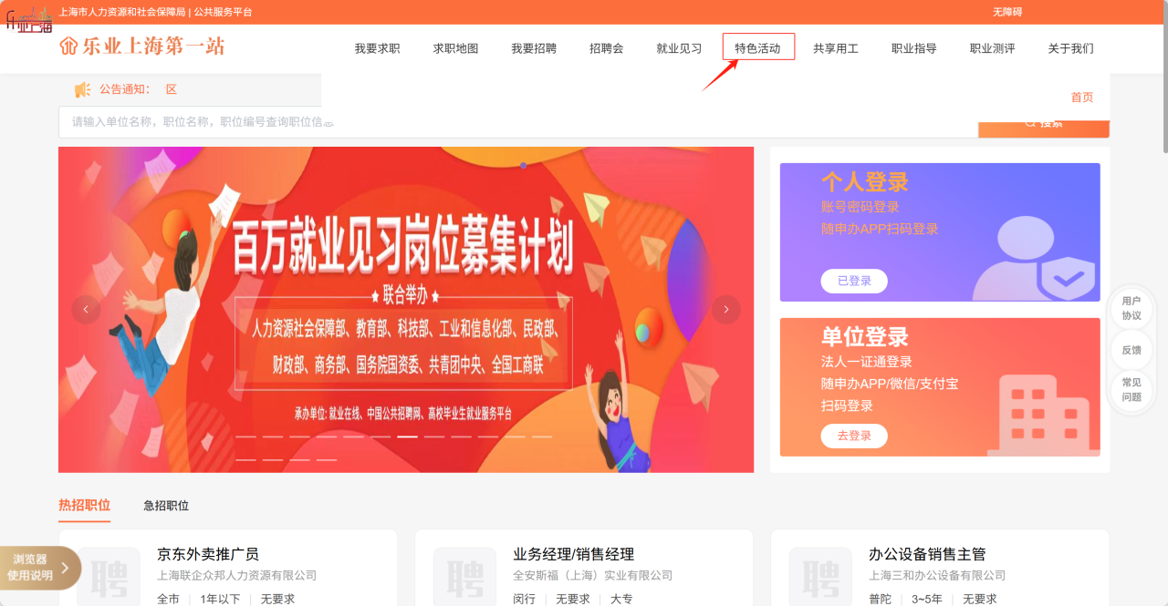 1. 打开网页“乐业上海第一站”并完成登录,点击“特色活动”进入界面。