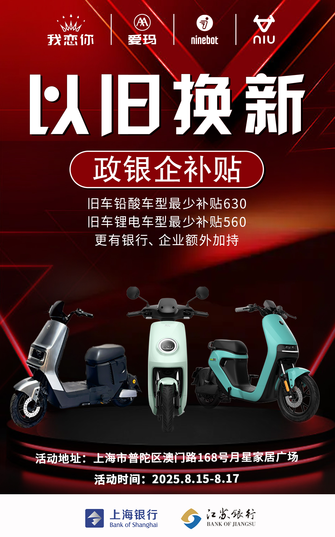 来源: 上海普陀为落实2025年上海市电动自行车以旧换新补贴政策,加速淘汰老旧车辆,普陀区从今日起在澳门路168号月星家居广场举办“电动自行车以旧换新”惠民专场活动。活动期间,政企银联合发力,多重补贴叠加,“国家补贴 + 企业让利 + 品牌回收 + 银行助力= 四重补贴直抵车价”,您只需“骑旧车来,开新车回”。