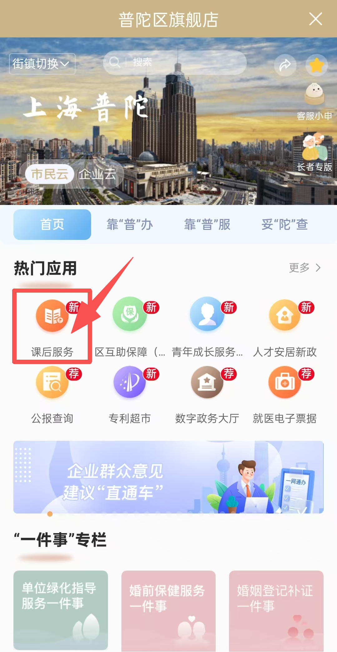 第二步,进入普陀旗舰店后,首页找到“课后服务”点击进入。
