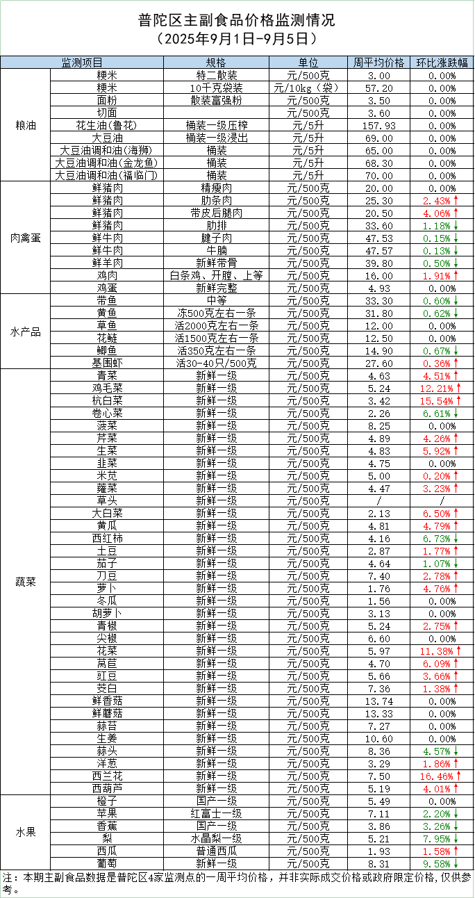 普陀区主副食品价格监测情况 (2025年9月5日)
