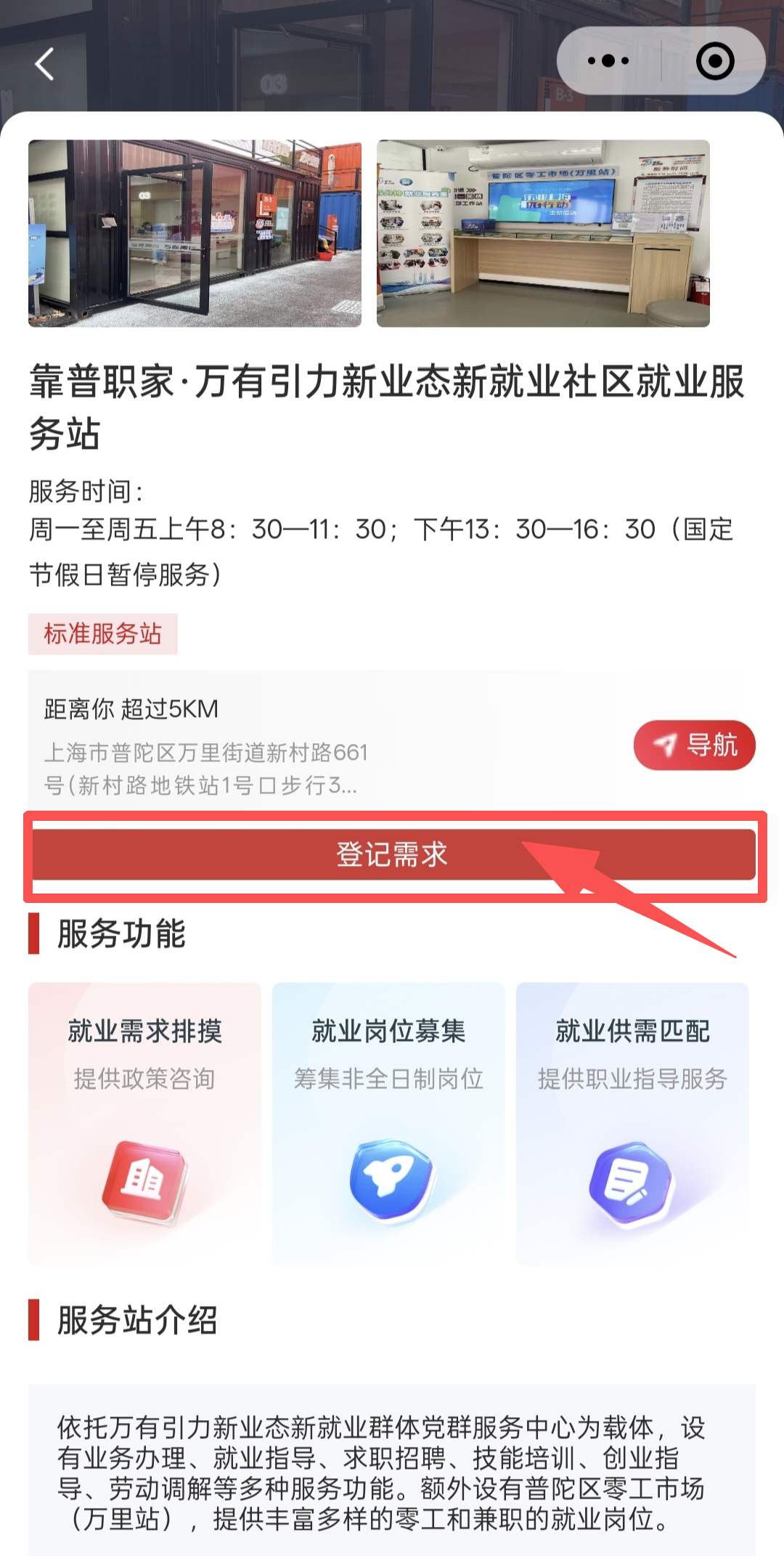 3、选择对应站点,点击“登记需求”,就能一键登记您的就业服务需求。(提示:需通过微信验证手机号)