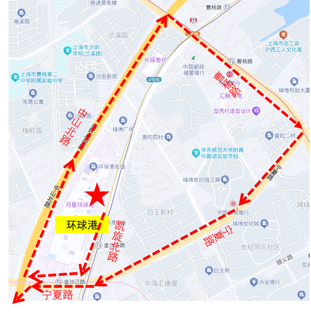 19时花车出发,沿凯旋北路——宁夏路——中山北路——曹杨路——宁夏路,最后从内环外圈金沙江路上匝道驶出普陀区。