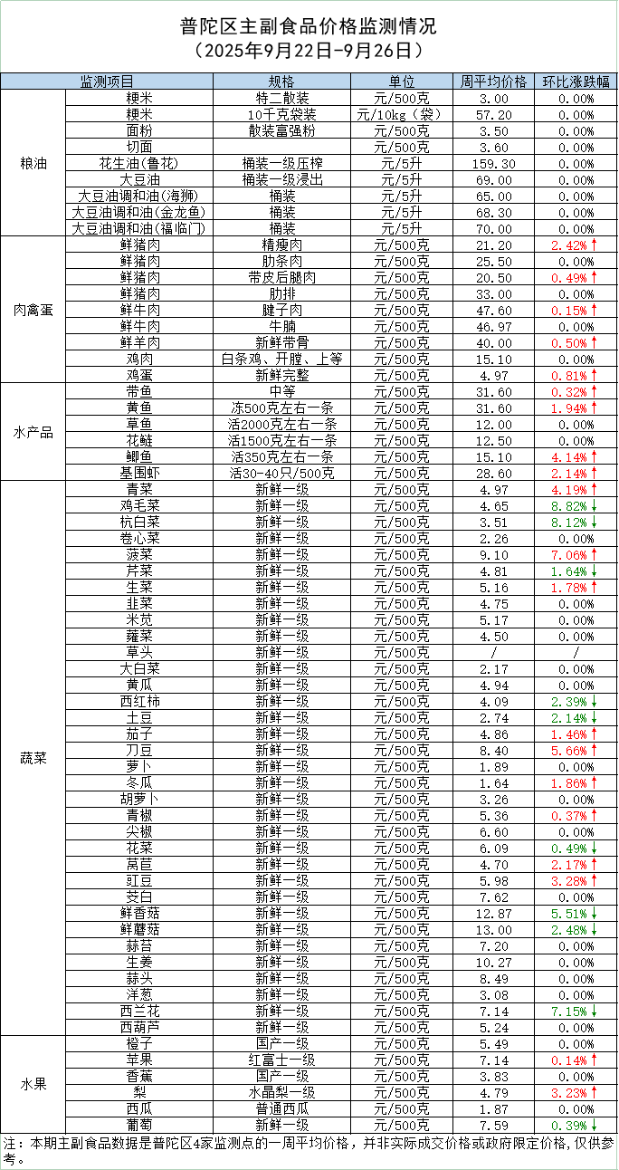 普陀区主副食品价格监测情况 (2025年9月26日)