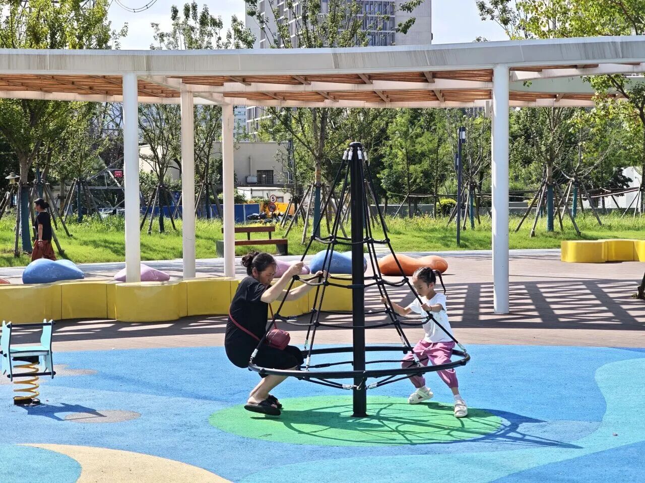 步入公园,首先映入眼帘的是成片绽放的绣球花,公园以多彩绣球为特色,被划分为云享湾、锦鲤坊、秀田里、林语塘、繁花境五个区域。园内还设有沉浸式儿童友好型乐园,设置了塑胶场地、滑梯、攀爬等无动力游乐设施,深受亲子家庭青睐。