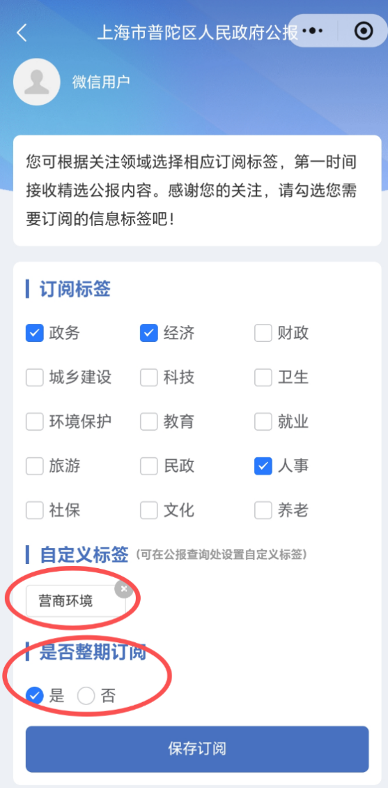 来源: 上海普陀为帮助企业群众快速获取所需政策信息,近日,区府办联合区融媒体中心对“上海市普陀区人民政府公报”微信小程序进行功能迭代升级。在原有公报15个主题标签分类的基础上,全新推出“自定义订阅”服务,为用户带来更具个性化的政策查询体验。
