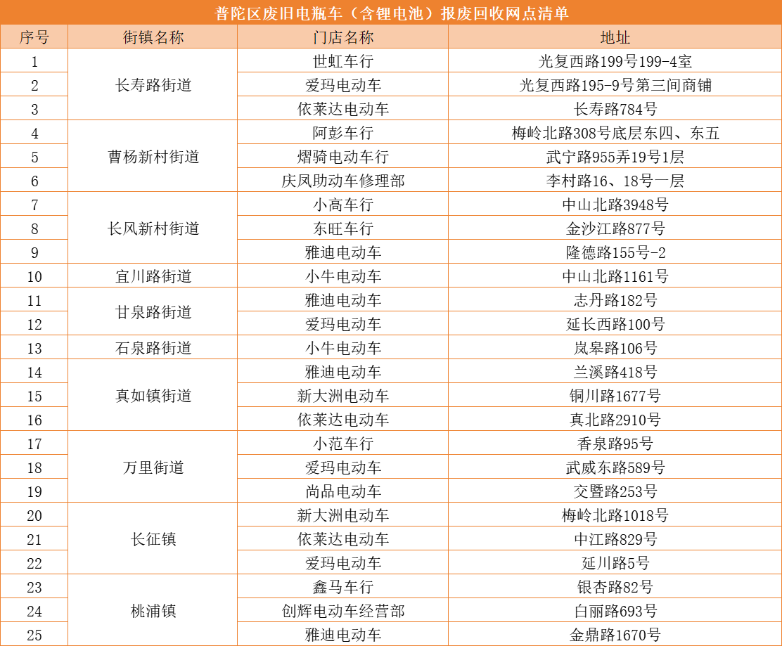 来源: 上海普陀充电时突然起火、骑行中突发故障,电动自行车锂电池的安全隐患,你真的重视了吗?那些长期堆放在角落的废旧电瓶车占用着公共空间,老化锂电池在日晒雨淋后充电更易引发“热失控”!闲置的废旧电瓶车正悄然埋下威胁你我安全的重大隐患!为落实《电动自行车锂离子电池回收利用体系建设指南》及上海市废旧非机动车回收处置相关要求,有效防范化解电动自行车全链条安全风险,切实维护群众生命财产安全与社区环境整洁,普陀区在各街镇设立了废旧电瓶车(含单独废旧锂电池)回收点位,快来看看吧!