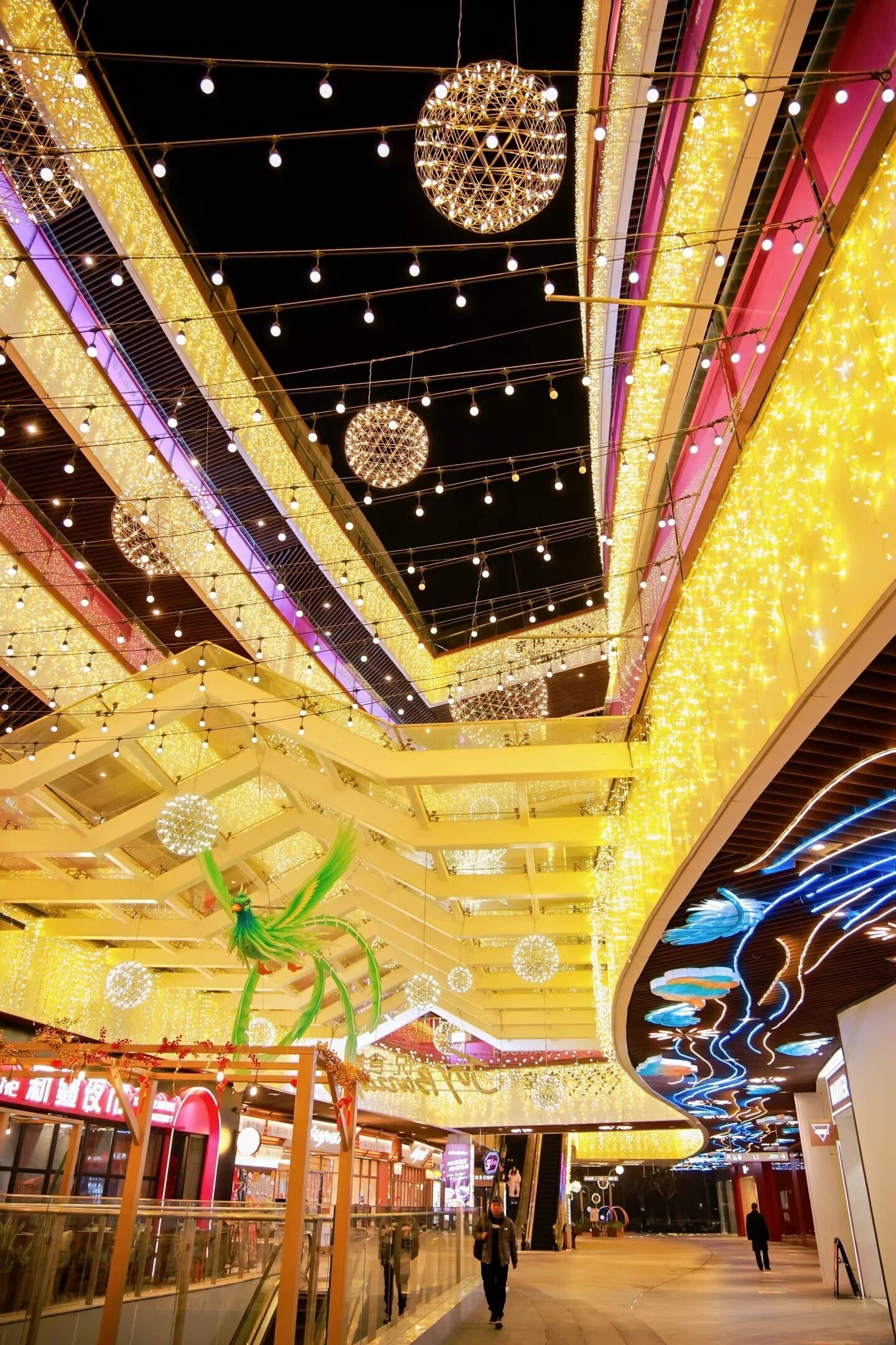 氛围营造同步升级,春节期间全区景观照明延长启闭时间,多个点位播放马年主题夜景视频;真如商圈、天安千树、长风大悦城等实施灯光亮化工程,串联半马苏河滨水盛景。各大商圈布置马年美陈与地标装置,多条道路悬挂灯笼、中国结,年味十足。