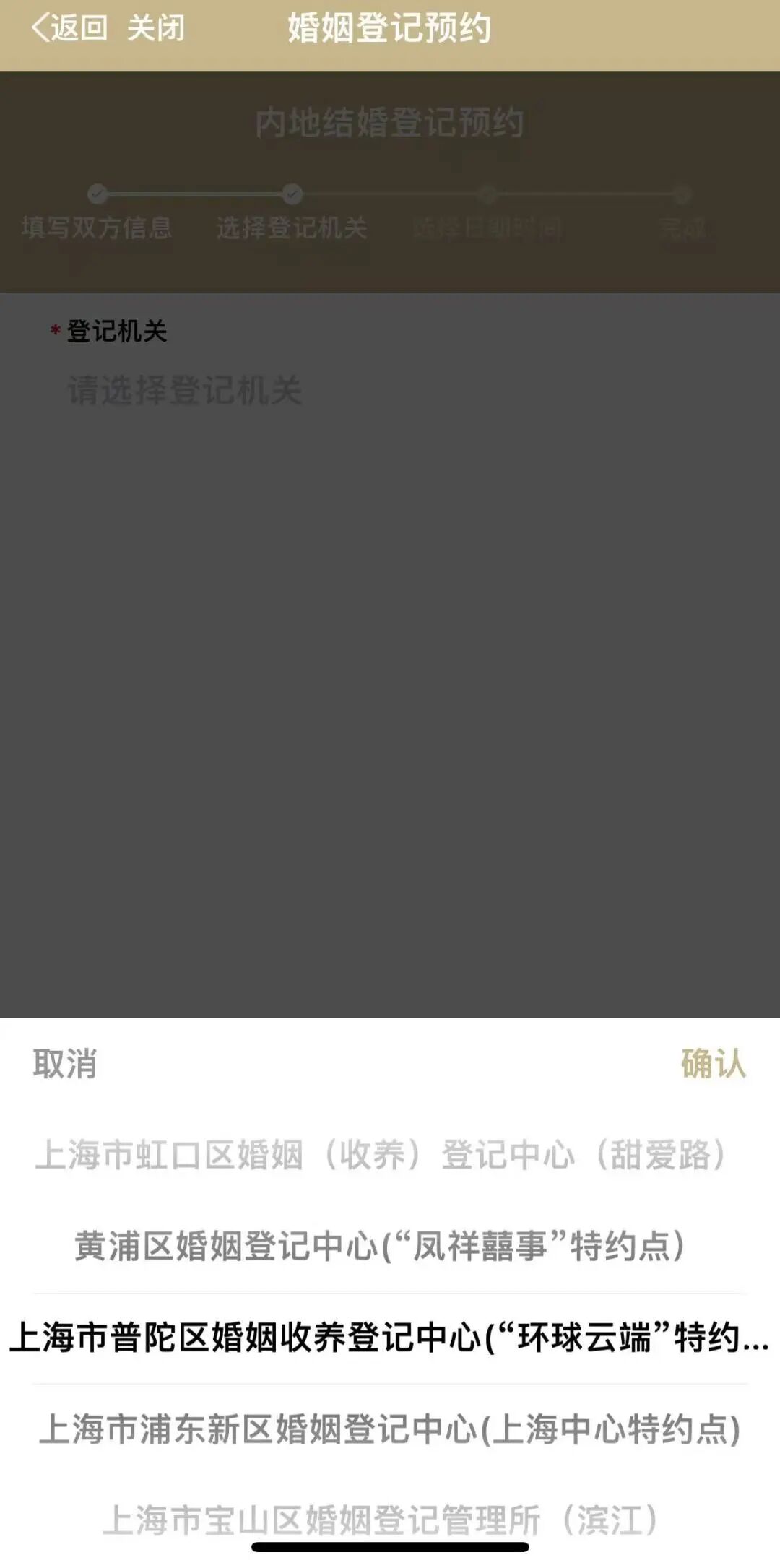 在随申办App或随申办小程序搜索“婚姻登记预约”,选择【普陀区婚姻收养登记中心(“环球云端”特约点)】进行预约(2月28日上午9点开启预约,需至少提前1个工作日预约,当天限约15对),操作如下: