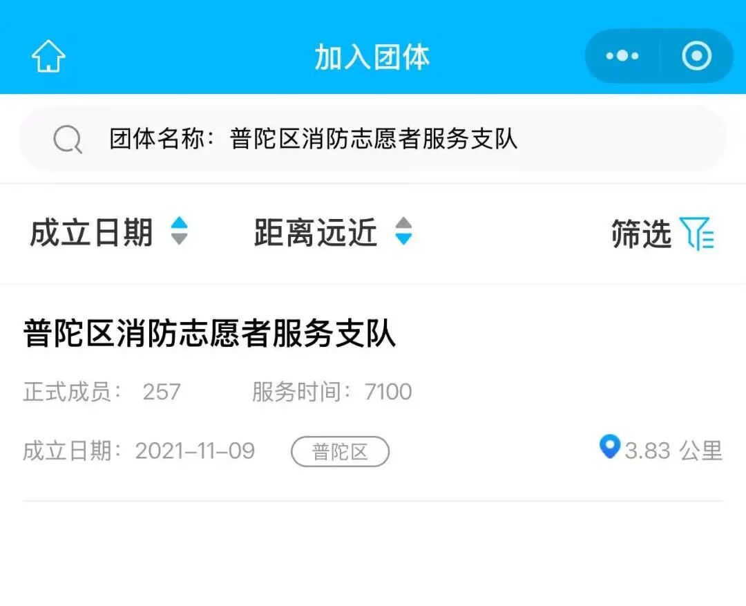 2、小程序主页搜索志愿团体名称【普陀区消防志愿者服务支队】,点击进入主页。
