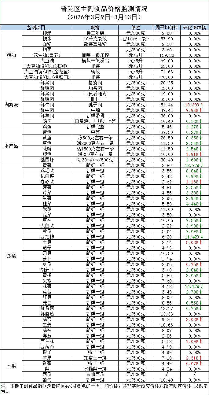 普陀区主副食品价格监测情况 (2026年3月13日)