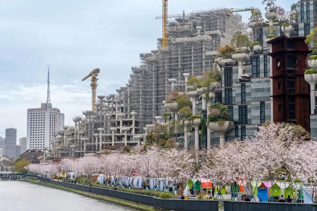 除此之外,前不久刚封顶的天安千树二期也正在加紧建造中,苏州河畔的第二座山峰即将拔地而起。不同于天安千树一期以商铺产业为主,二期以“办公+酒店”为主要建造方向,将引入上海首家凯悦甄选设计师酒店等,进一步推动长寿商圈的辐射、扩大。