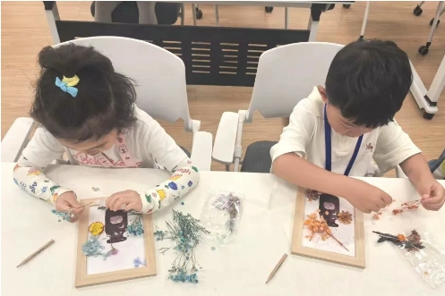 现场,老师向孩子们展示了如何巧妙组合干花、粘贴固定,孩子们围坐在一起,眼中满是期待,迫不及待地想要动手制作。