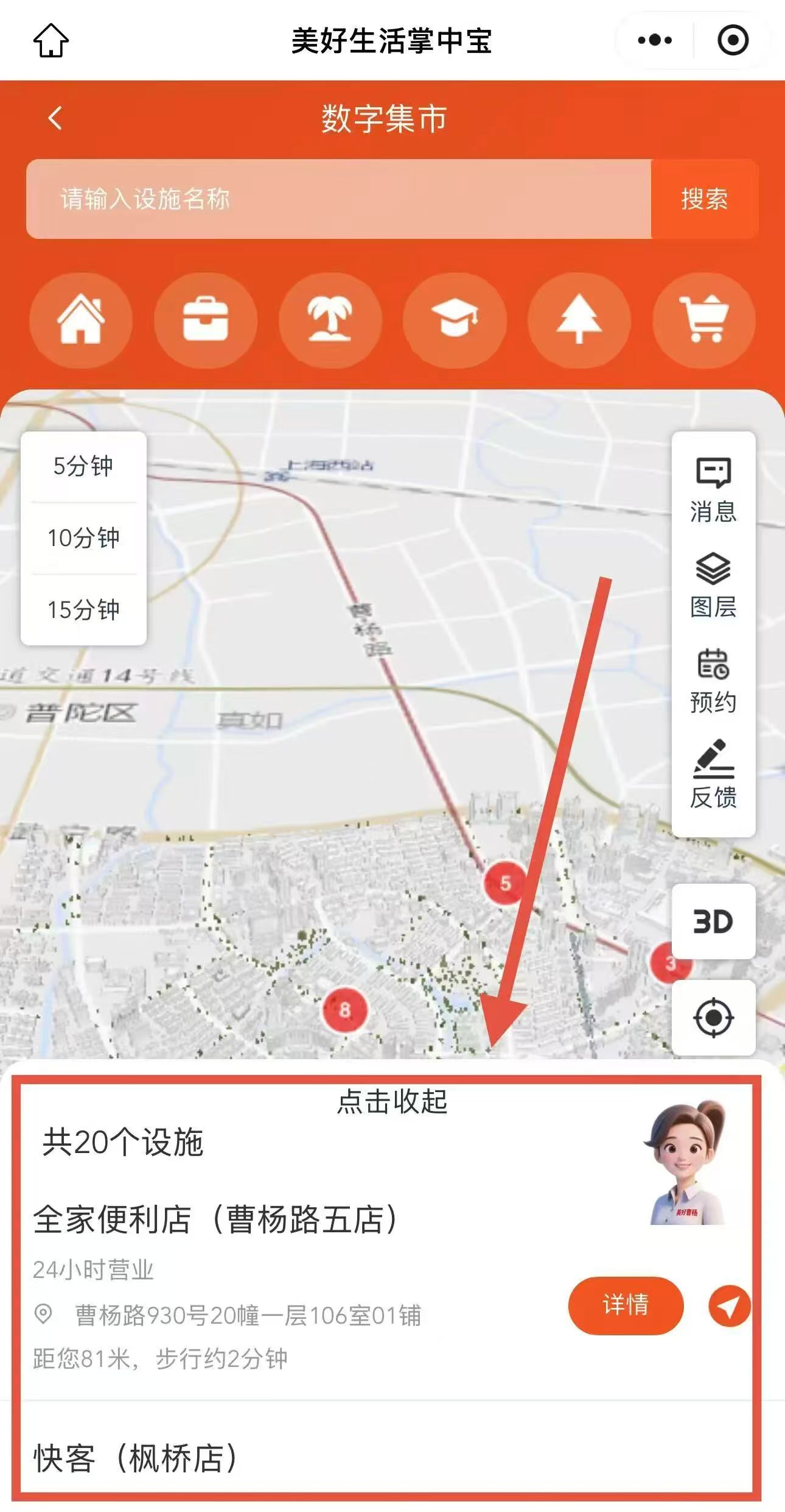 在“美好生活·掌中宝”智能应用平台的“掌上地图”板块新增“便民服务地图(公共事业费缴纳)”,曹杨居民足不出户即可一键查询水、电、气、通信等线下缴费点的地址、营业时间、服务范围等详细信息,让便民服务信息尽在“掌”握。